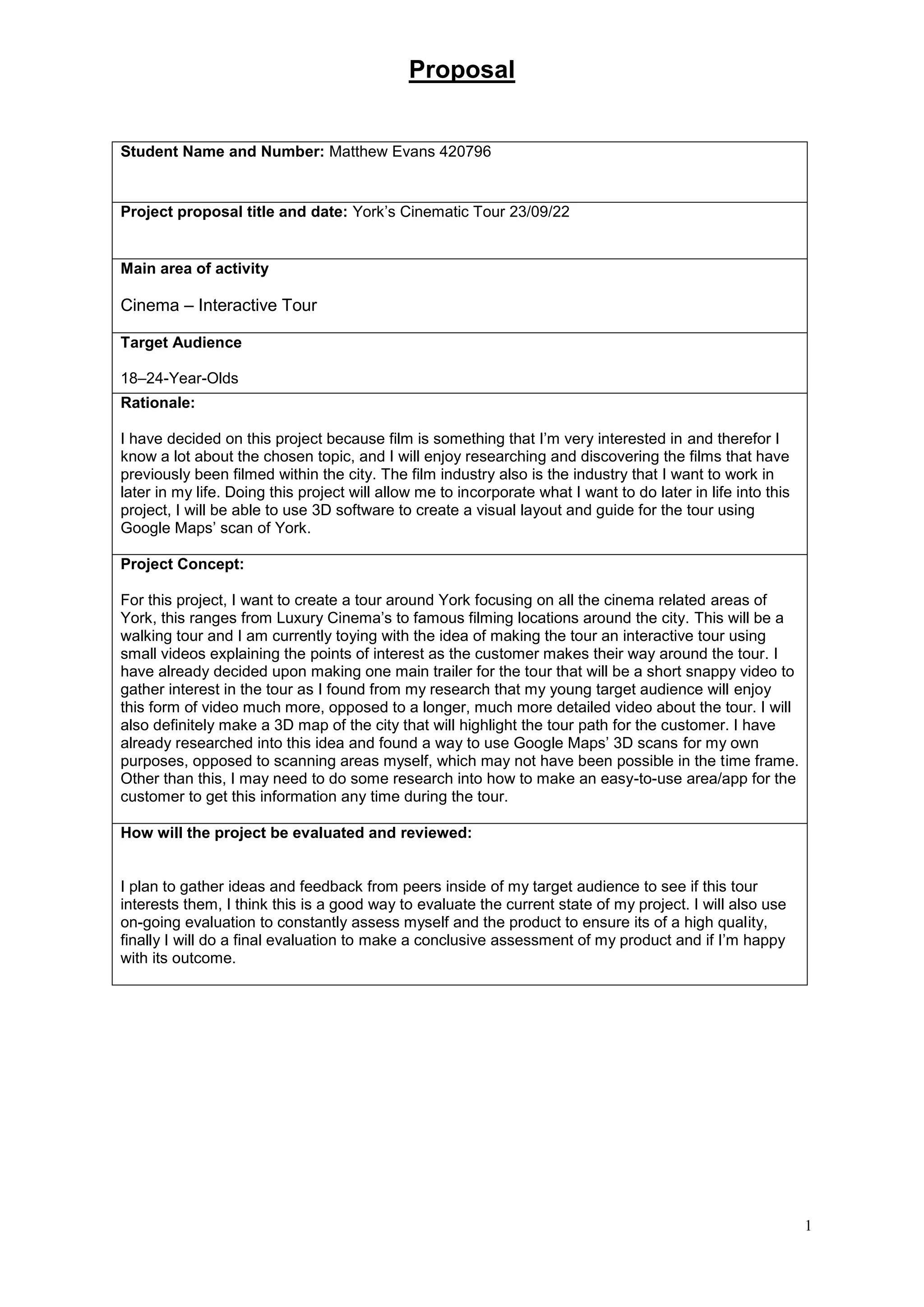 Matthew Evans proposes an interactive cinematic tour of York for 18-24 year olds. The tour will highlight York's film locations and cinemas using videos, a 3D map created from Google Maps scans, and a mobile app. Evans will gather feedback from peers and evaluate the project ongoing and at completion to ensure high quality.
