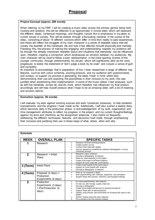 The document provides details on the target audience and proposal for a music video project. It describes the intended audience as primarily younger adult males aged 16-25 from lower to middle socioeconomic classes. Research was conducted through surveys and interviews to understand the target demographics. The proposal includes a schedule outlining pre-production, production, and evaluation phases across 12 weeks, as well as concept details, evaluation plans, and a bibliography of research sources.