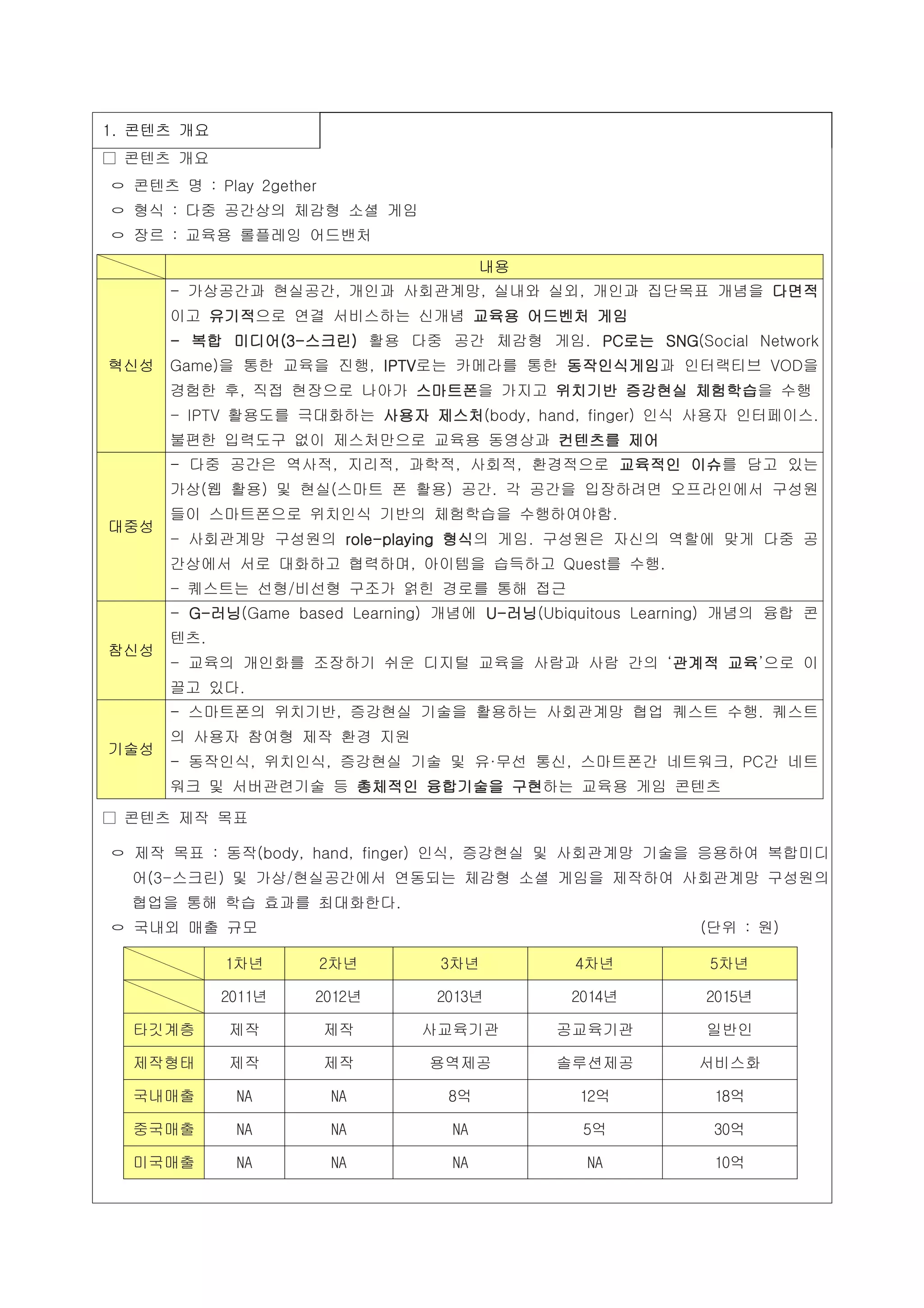 - 동작인식, 위치인식, 증강현실 기술 및 유·무선 통신, 스마트폰간 네트워크, PC간 네트