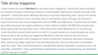 The document proposes a new rock music magazine called "Mordant" targeted at females aged 16-20 in the UK. Key points: