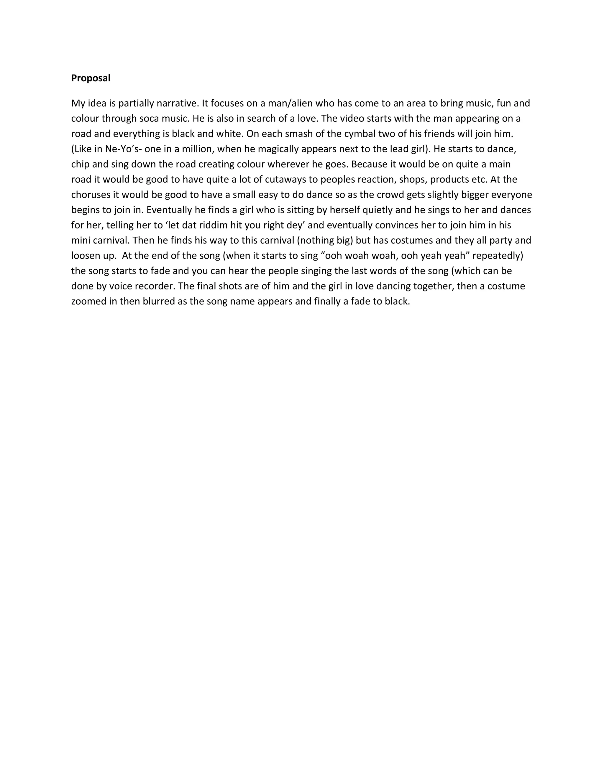 A man/alien arrives on a black and white road and uses soca music, dancing, and color to bring fun and joy to the area. As he sings and dances down the road, more people join in and color is created wherever he goes. He tries to convince a girl sitting alone to have fun and dance with him. Eventually, he leads everyone to a small carnival where they party and loosen up. At the end, he and the girl are in love, dancing together before the song title appears.