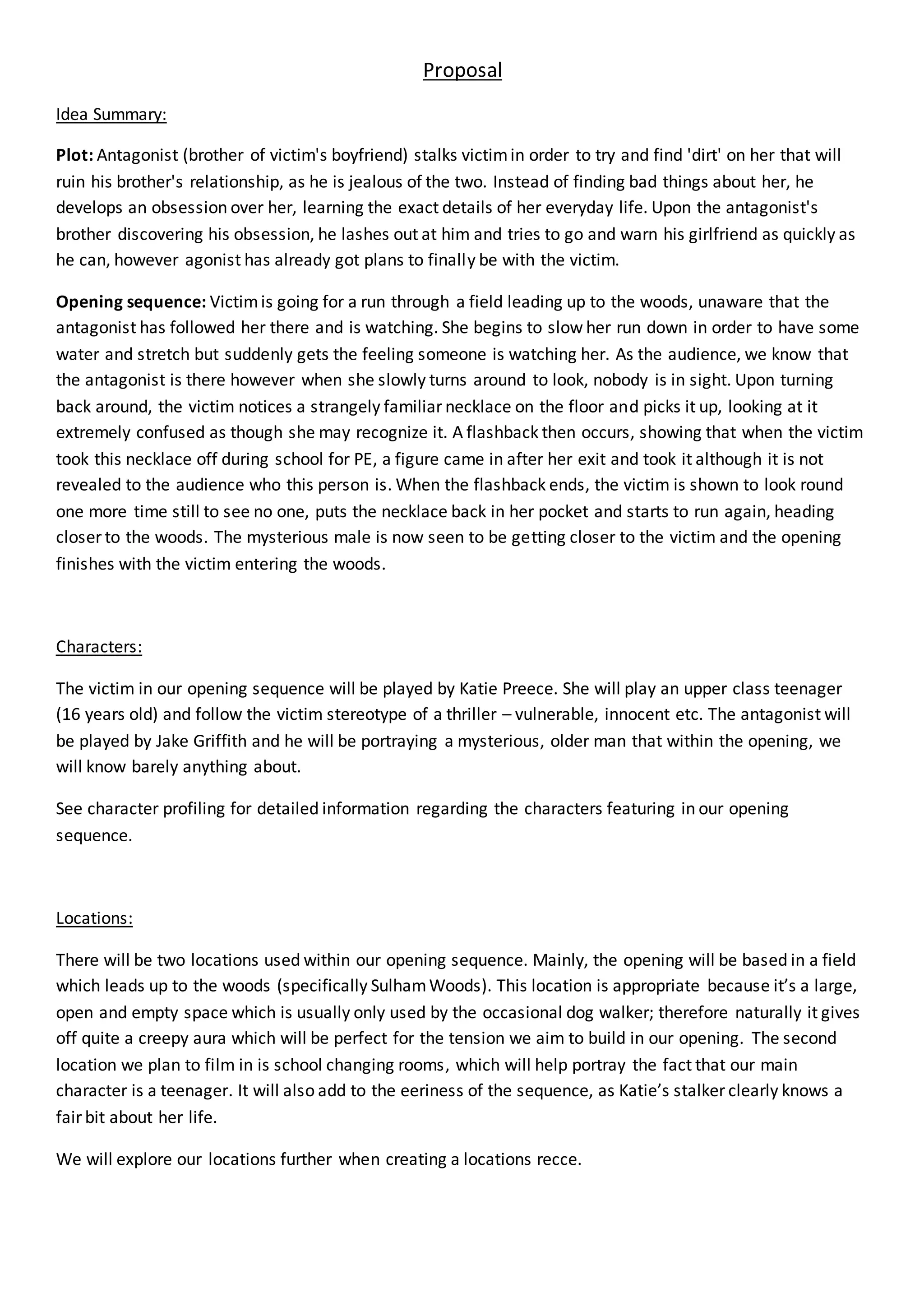 The opening sequence follows a victim who is stalked by her boyfriend's jealous brother while running through a field. As she runs, the stalker watches her from a hidden location. She finds a necklace on the ground that triggers a flashback, revealing the stalker had been in her school changing room. Though she sees no one around, the stalker begins following her closer as she enters the nearby woods. The sequence establishes the victim, location, and introduces the mysterious stalker character and builds tension through music and camerawork.
