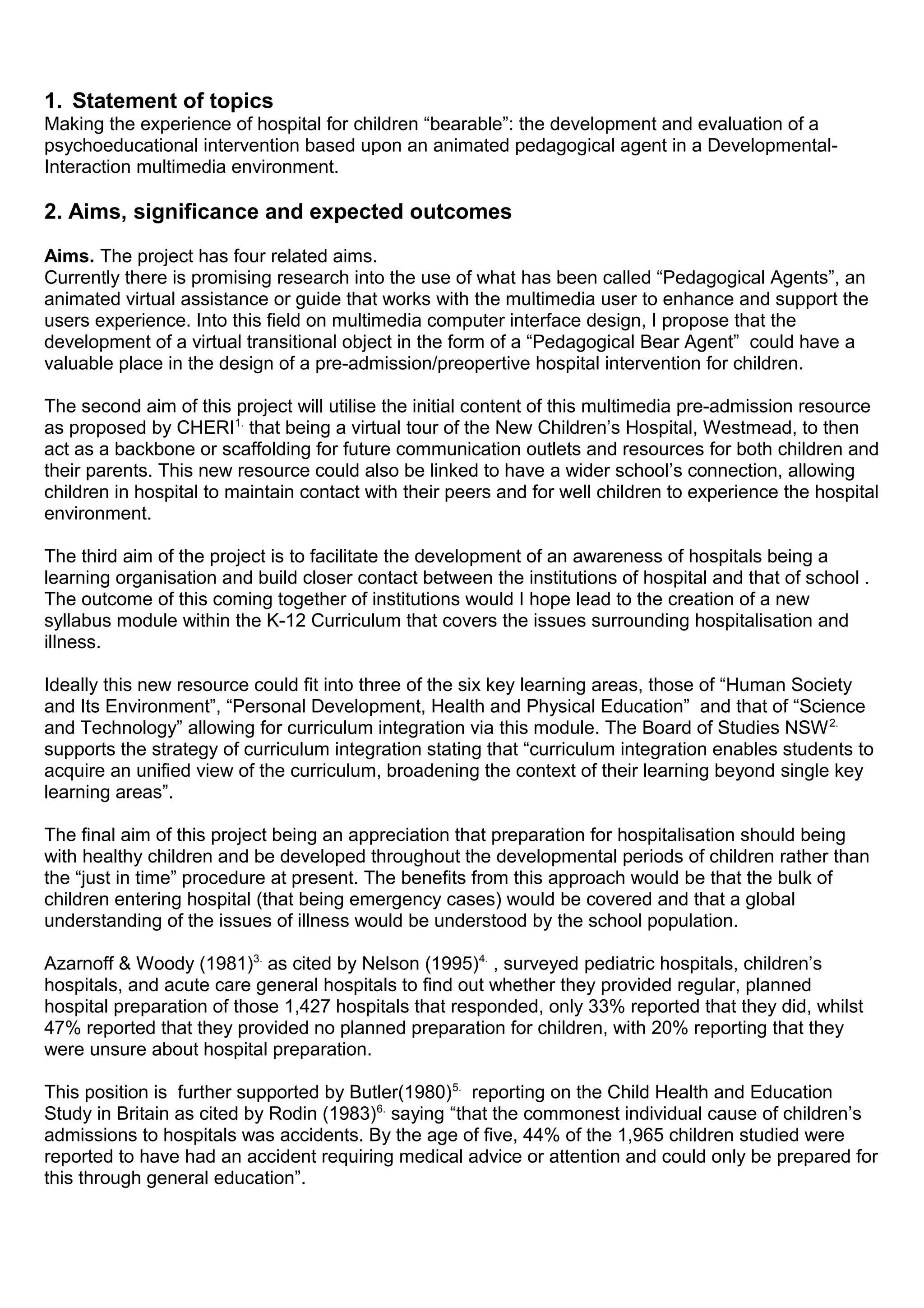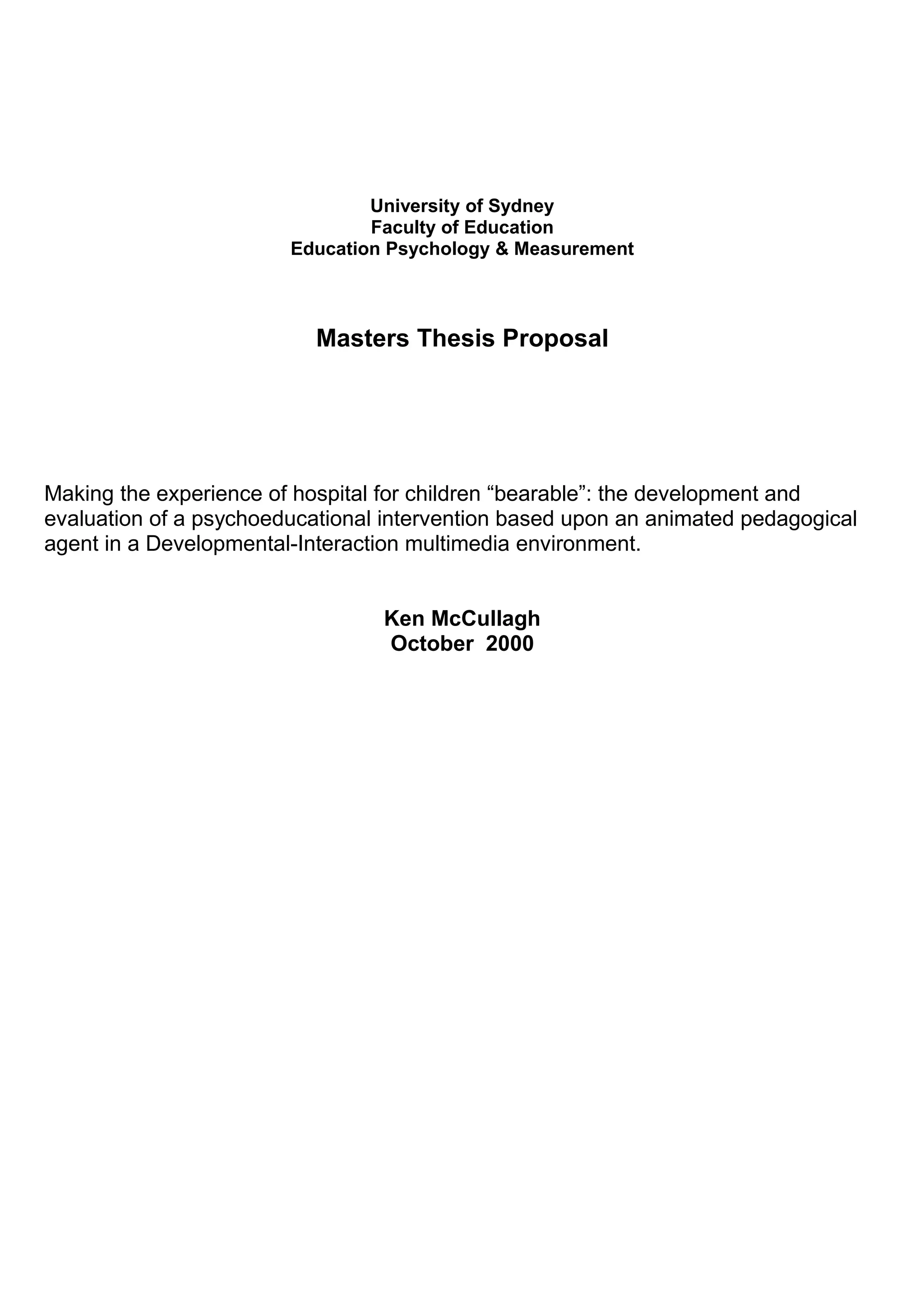 This document summarizes a masters thesis proposal about developing a multimedia intervention using an animated pedagogical agent (like a teddy bear) to help make the hospital experience more bearable for children. The project aims to reduce stress for children with chronic illnesses and create a resource that can be used for pre-admission as well as maintaining connections between hospitals and schools. It reviews literature supporting the use of agents and pre-admission preparation to provide information, encourage emotional expression, and build trusting relationships to help children cope with medical procedures.