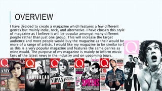 Jessica proposes creating a monthly magazine focused on indie, rock, and alternative music genres. She believes this variety of genres will attract a broader audience than a magazine focused on just one genre. The magazine will be similar to Q magazine, featuring news, albums, singles, tours and both established and up-and-coming artists. Its target audience will be 16-30 year olds interested in concerts and festivals, and it will also appeal to older collectors through limited edition issues focused on single artists.