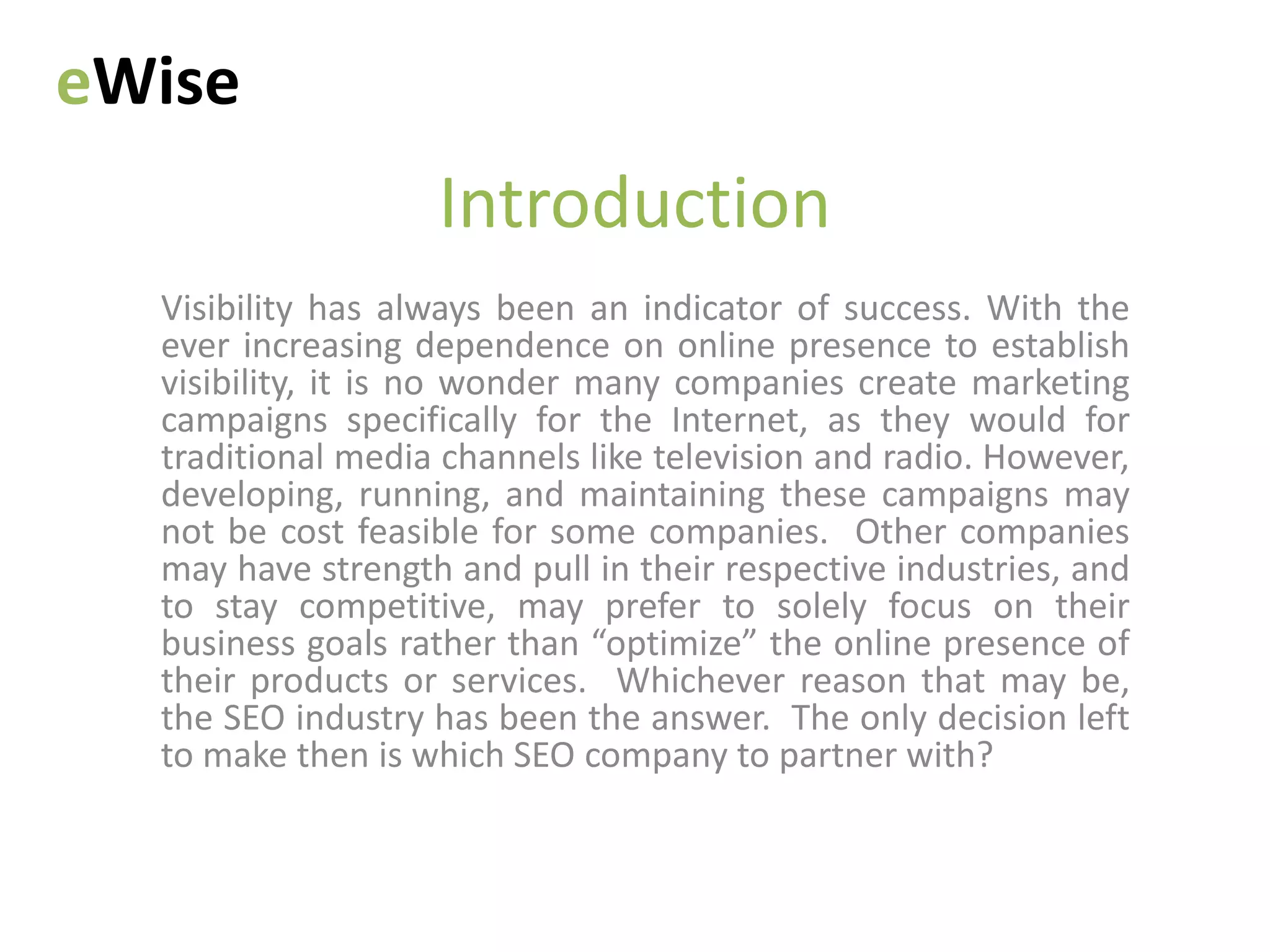 Ewise offers customized SEO services focused on maximizing client ROI and adapting to specific industry needs, with community-oriented growth. They provide a range of services including keyword analysis, content optimization, mobile optimization, social media advertising, video production, and pay-per-click advertising. Ewise also has a referral program that offers discounts for new clients and emphasizes accountability with short contract terms to evaluate performance results.