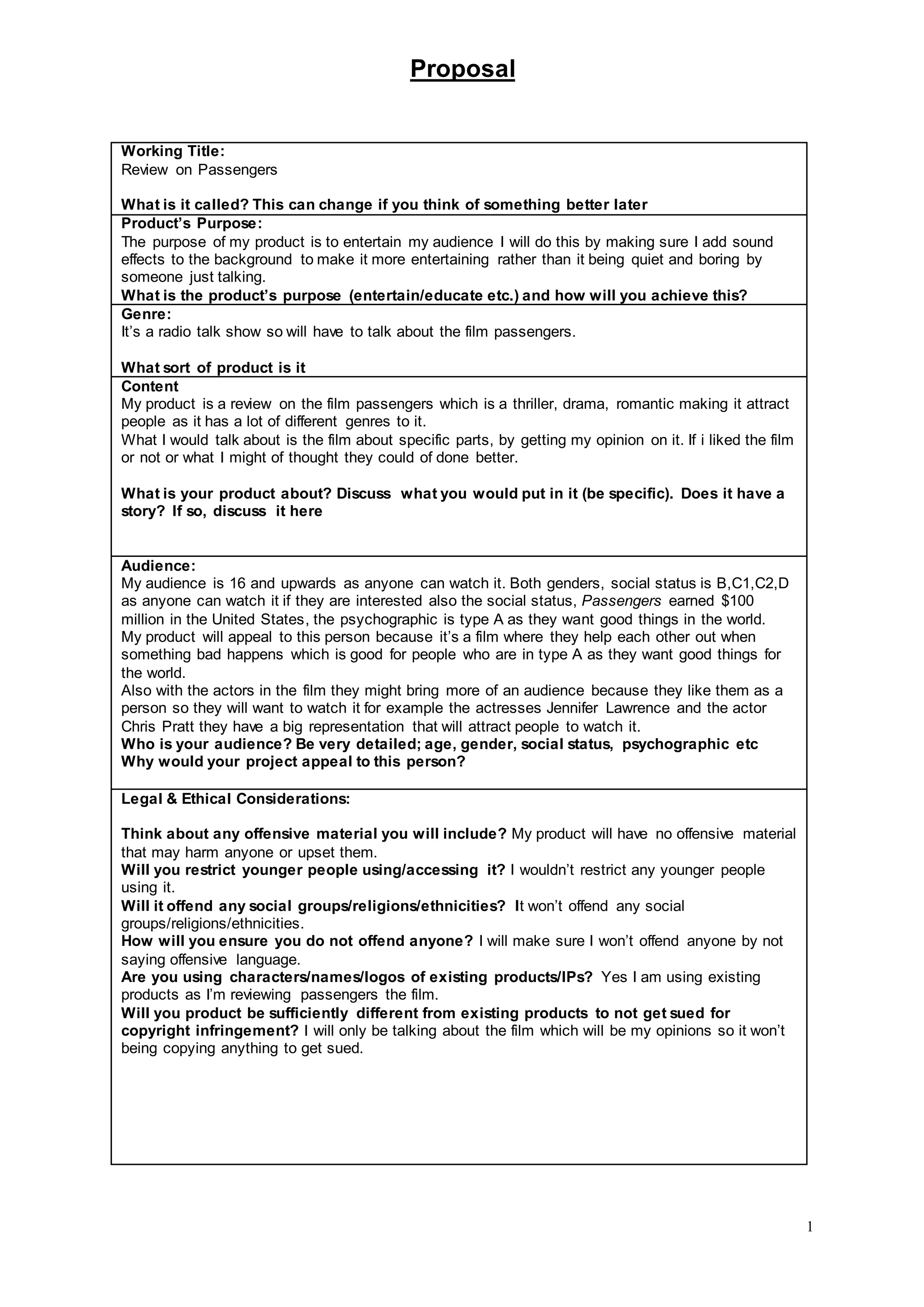 The document outlines a proposal for a radio talk show reviewing the film 'Passengers,' aiming to entertain its audience through a blend of sound effects and personal opinions on the film's merits. It targets an audience aged 16 and older, with a focus on both genders and various social statuses, particularly appealing to type A psychographics who appreciate positivity in narratives. The product will avoid offensive material and is designed to be distinct from existing products to prevent copyright issues.