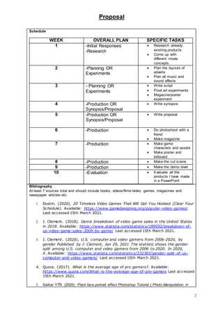 The document proposes a video game called "Dream of Dreams" based on a movie concept. The game would target women ages 15-25 and involve completing levels that represent dreams. Each level introduces a new mission to help the main character, Ash, escape her dreams and return to reality. The proposal outlines plans to research similar adventure games, create cut scenes, character designs, and promotional materials like magazines and posters to advertise the game. A schedule is proposed to complete tasks over 10 weeks, including a photoshoot, gameplay development, and final evaluation.