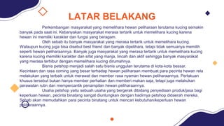 The document is a proposal for a pet shop called "ANAN PETSHOP" in Indonesia. It discusses the growing trend of pet ownership, particularly cats, and explains how pet shops have become a popular business. It outlines the proposal's goals of caring for animal welfare, developing hobbies related to pet care, and raising public awareness. Plans include identifying issues, forming a work team, evaluating strategies, and choosing applications for payments. The proposal also includes pictures and graphics related to pet care.