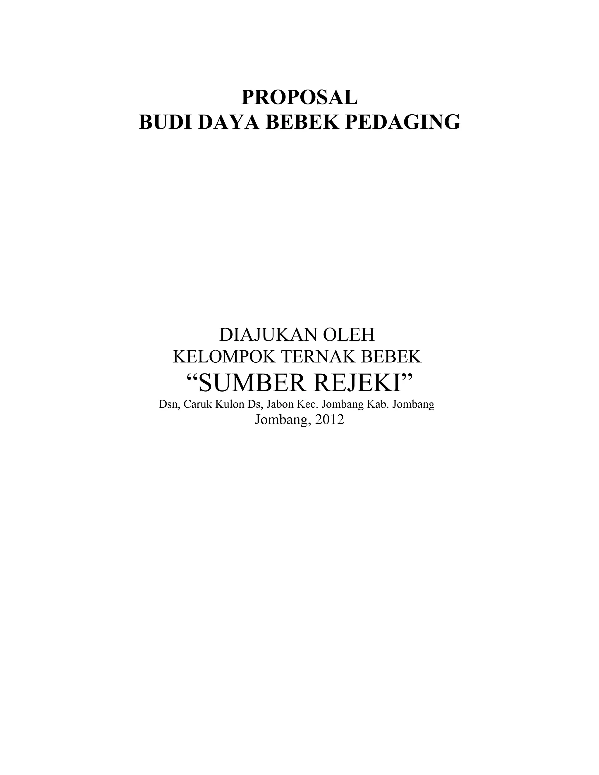 Proposal ini mengajukan permohonan dana sebesar Rp75 juta untuk modal usaha budidaya bebek pedaging oleh Kelompok Ternak Bebek "Sumber Rejeki" di Desa Jabon, Jombang. Usaha ini bertujuan mengurangi pengangguran dan memberikan nilai tambah bagi masyarakat melalui peternakan dan pemasaran daging bebek.