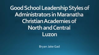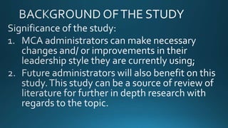 This document discusses a study on leadership practices of school principals. It examines the extent to which principals demonstrate instructional and administrative leadership, and whether this varies based on the accreditation level of the school. The study measures the frequency of demonstrated leadership in these areas and looks for significant differences between accreditation levels.