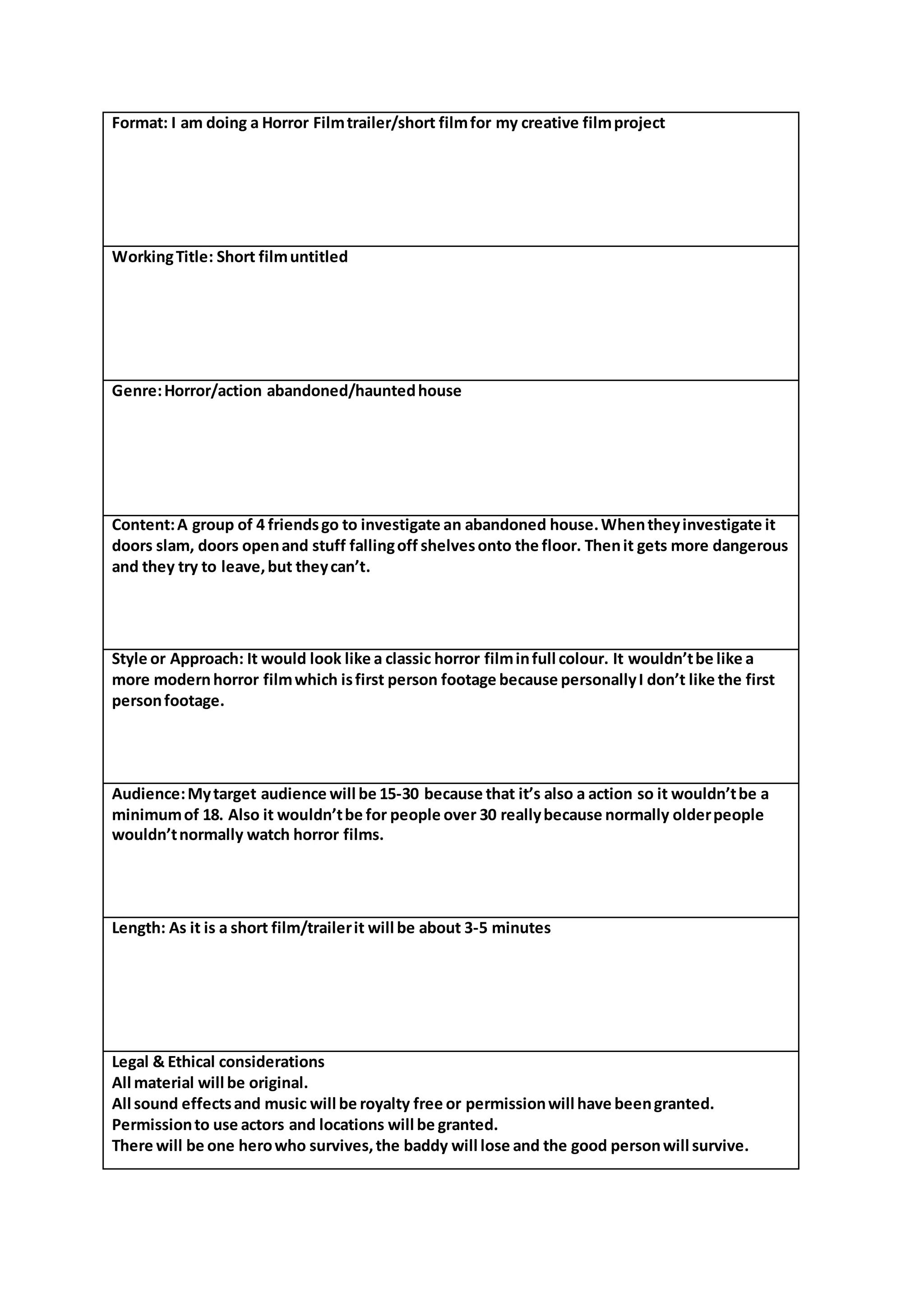 A group of four friends investigate an abandoned haunted house where strange events begin to occur, like doors slamming and objects falling off shelves. As things grow more dangerous, the friends try to escape but cannot leave. The short horror film, targeted at ages 15-30, will be 3-5 minutes and in full color in the style of a classic horror film, following the standard trope of the hero surviving while the antagonist loses. All content will be original or have permission to use, avoiding legal and ethical issues.