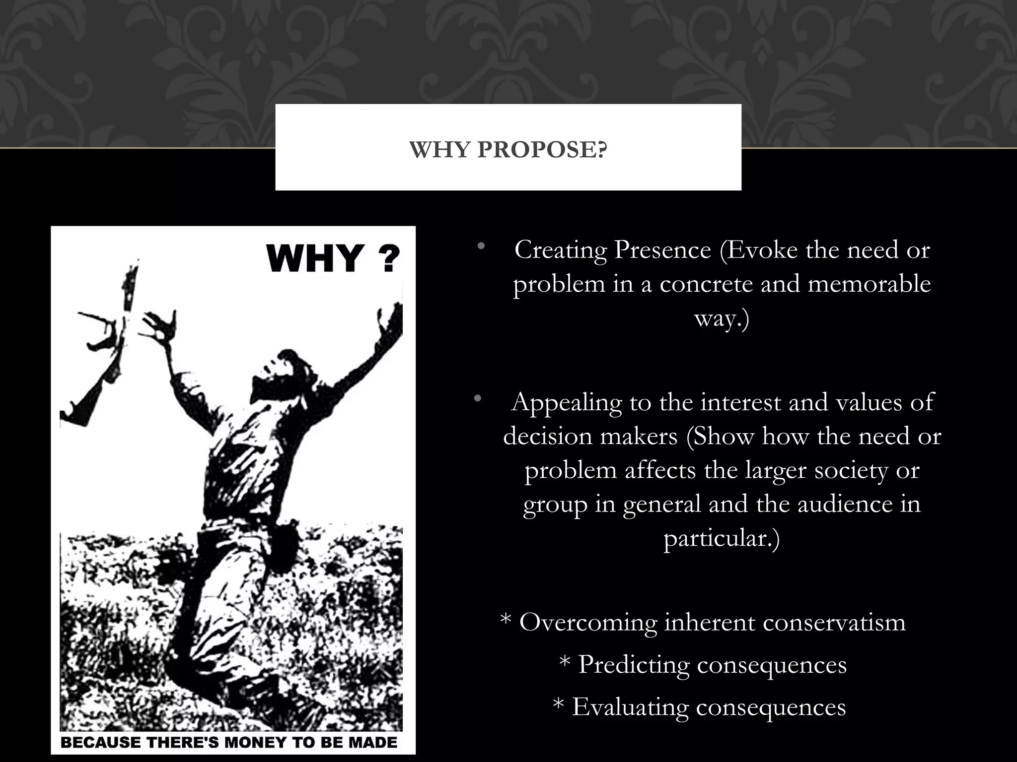 This document provides guidance on developing an effective proposal. It discusses key elements of a successful proposal such as clearly defining the problem, proposing a feasible solution, and anticipating objections. It also outlines questions a proposal should answer about the problem, audience, objectives, methods, and expected results. Finally, it offers possible proposal outlines and invention questions to help analyze problems, audiences, and solutions. The overall message is that a well-crafted proposal clearly defines an issue, proposes a practical solution, and convinces reviewers of the proposal's merits.