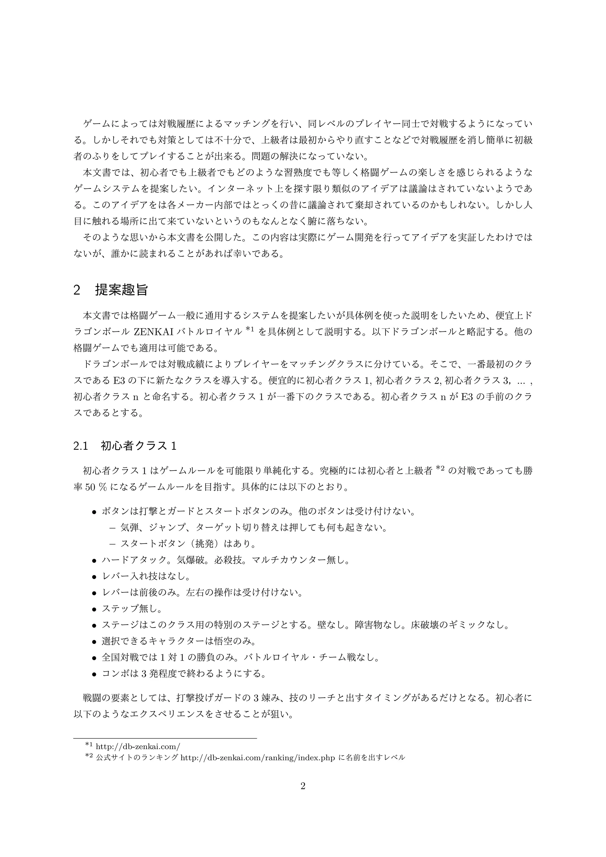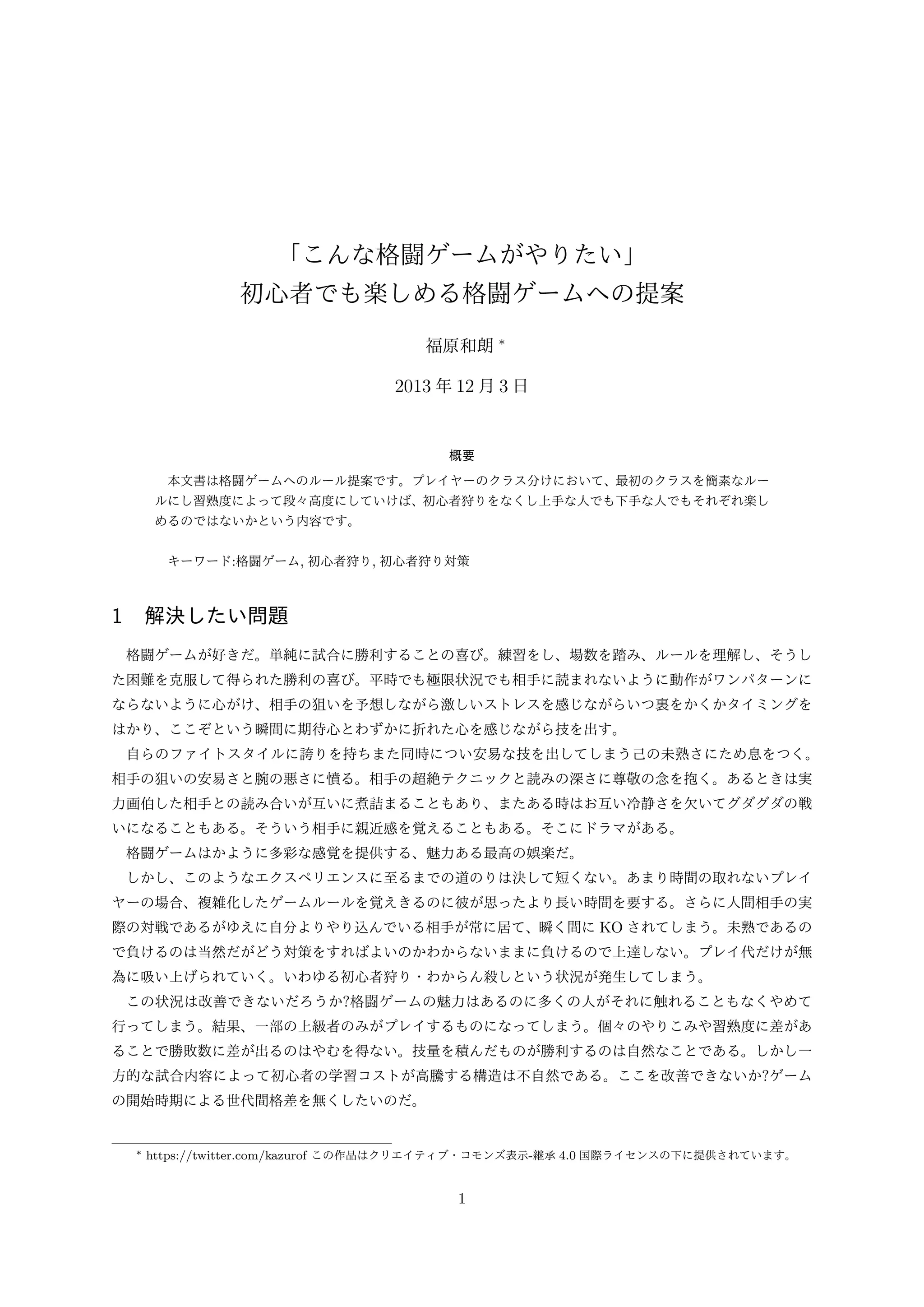 本文書は格闘ゲームへのルール提案です。プレイヤーのクラス分けにおいて、最初のクラスを簡素なルールにし習熟度によって段々高度にしていけば、初心者狩りをなくし上手な人でも下手な人でもそれぞれ楽しめるのではないかという内容です。