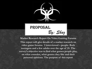 The document summarizes the results of a market research survey on video gaming forums. The survey interviewed both teenagers and adults over age 25 about the games they play, the consoles used, preferred genres, and their opinions. Most respondents reported playing on Xbox or PC, browsing YouTube daily, and not using gaming forums. First-person shooter games were the most popular genre while indie and racing games were the least popular. The majority of respondents had a favorite game and played console games.