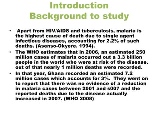This research proposal investigates the impact of malaria on maize farmers' productivity and income in the Ejura-Sekyedumase district of Ghana. It aims to determine the direct and indirect costs of malaria, including lost workdays and the economic burden of treatment, while comparing yields between affected and unaffected farmers. The study highlights the need for better understanding to guide policy making in improving agricultural productivity amidst malaria-related challenges.