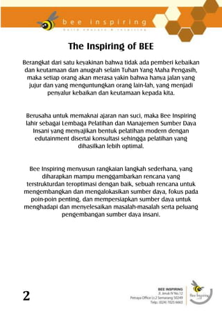 Bee Inspiring adalah lembaga pelatihan yang berfokus pada pengembangan sumber daya manusia melalui coaching untuk manajer dan pemimpin. Program ini bertujuan untuk membangun budaya kerja, meningkatkan profesionalisme, dan mempersiapkan peserta agar dapat menghadapi tantangan di dunia bisnis. Dikelola oleh para pelatih berpengalaman, program ini diharapkan dapat meningkatkan produktivitas dan kinerja tim dalam organisasi.
