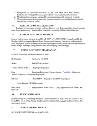 Proposal kegiatan jalan sehat ini diadakan untuk memperingati HUT RI ke-67 dengan tujuan mempererat silaturahmi, membangkitkan semangat juang pahlawan, dan memupuk semangat kebangsaan. Kegiatan ini diharapkan dapat melibatkan berbagai elemen masyarakat termasuk siswa dan tenaga pendidik, serta dilaksanakan pada 12 Juli 2012 di Kecamatan Bojongsari. Dengan tema 'Kembangkan Kreativitas, Semangat Olahraga, dan Solidaritas', diharapkan partisipasi ini dapat mengembangkan nasionalisme dan kreativitas peserta.
