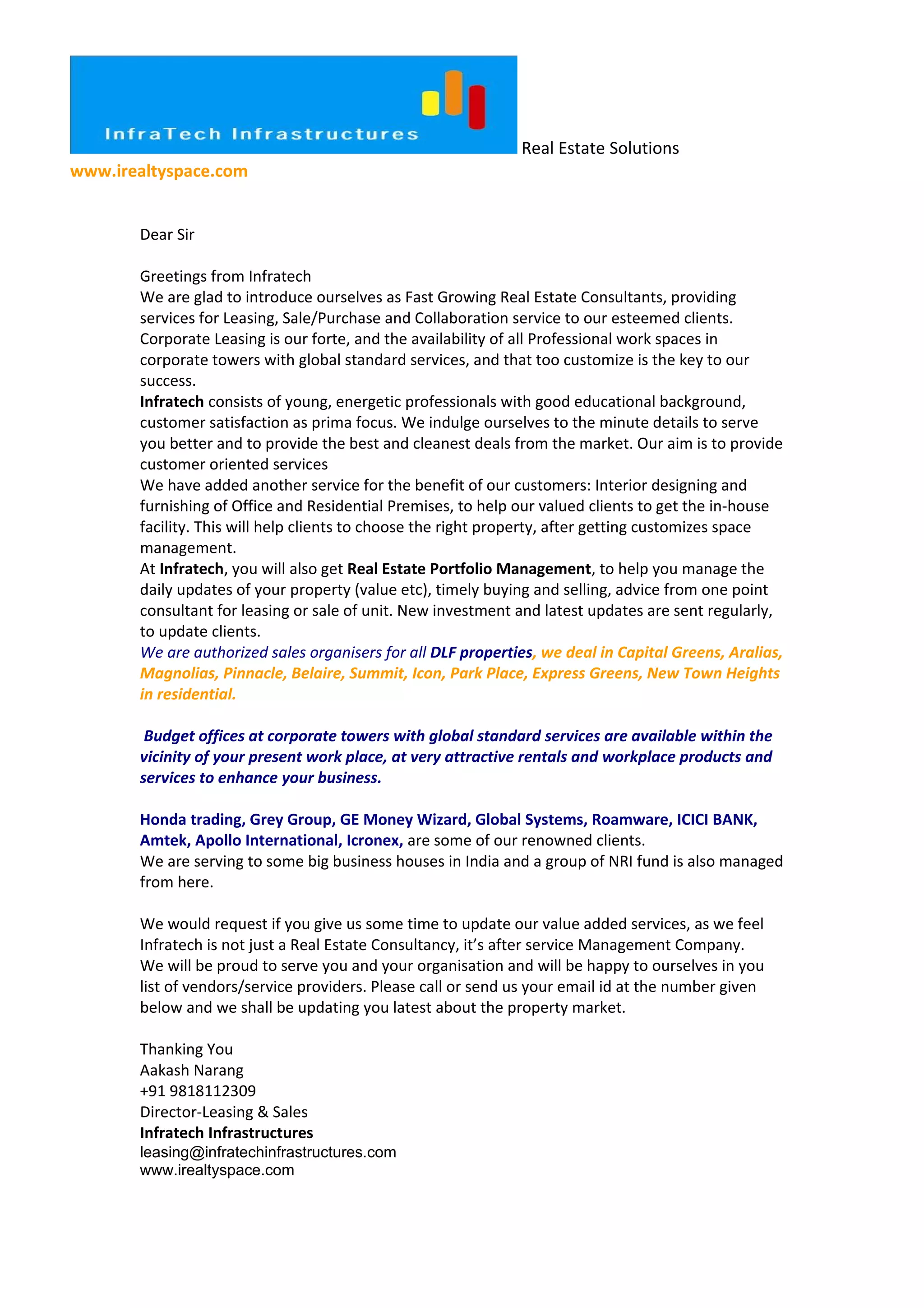 Infratech is a real estate consultancy firm providing services for leasing, sales, purchases, and collaborations. They specialize in corporate leasing and providing customized workspaces in office towers. The firm aims to provide customer-oriented services and details to better serve clients. Infratech also offers interior design and furnishing services for offices and homes. They provide real estate portfolio management to help clients manage property values and timely investment advice.