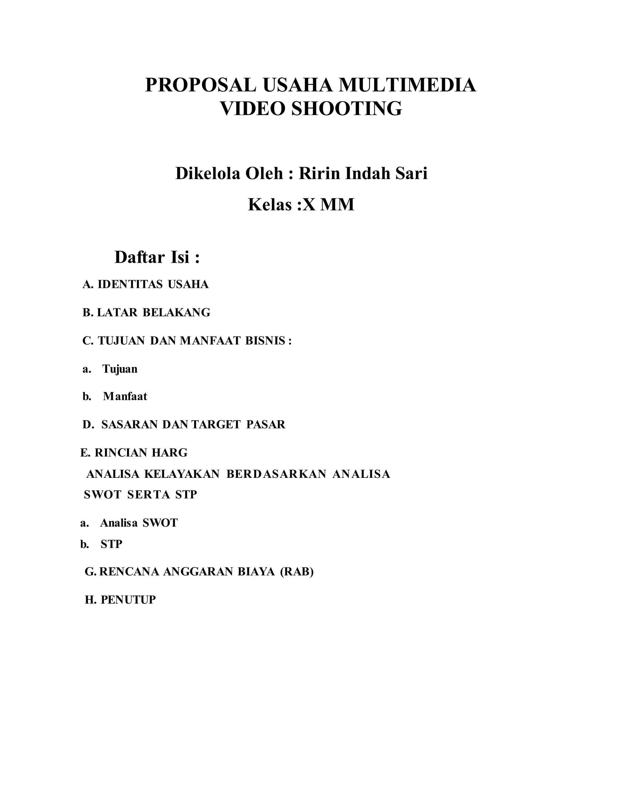 Proposal ini menjelaskan usaha multimedia Ririn Film yang menawarkan layanan video shooting, editing, dan cetak foto. Bisnis ini bertujuan untuk menciptakan lapangan pekerjaan dan memanfaatkan perkembangan teknologi dalam bidang multimedia. Dengan analisa SWOT dan rencana anggaran biaya, usaha ini diharapkan dapat berkontribusi pada perekonomian lokal dan memenuhi kebutuhan konsumen di wilayah Bantul dan Wonosari.