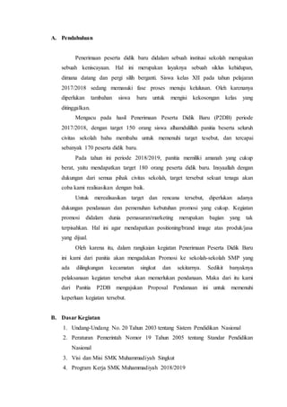 Proposal ini menjelaskan rencana kegiatan Penerimaan Peserta Didik Baru di SMK Muhammadiyah Singkut untuk tahun pelajaran 2018/2019. Panitia bertujuan mendapatkan 180 siswa baru melalui promosi di 10 sekolah sekitar. Kegiatan akan berlangsung Februari-Juli 2018 dengan 6 jurusan yang ditawarkan.