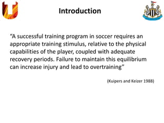 This document provides a literature review on the use of heart rate variability (HRV) as a monitoring tool for training load in elite youth soccer players. It discusses how HRV can reflect autonomic nervous system balance and fatigue levels. The study aims to document daily variations in HRV, training load, session RPE, wellness measures, and performance tests over a 6-week pre-season period. Correlations between HRV, training load, sRPE, and psychometric data will be examined to evaluate HRV as a monitoring tool for training responses and recovery in youth soccer players.