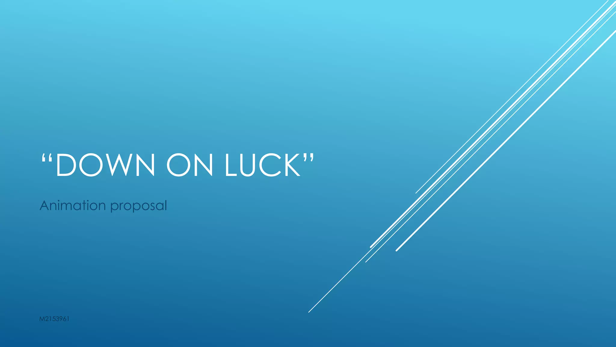 The animation proposal is titled "Down on Luck" and follows a character named Noel who is isolated, depressed, and has a constant floating cloud above his head. Noel is experiencing financial troubles like losing his job and debt on top of going through a divorce, pushing him to contemplate suicide. Throughout his struggles, images of children appear who eventually come into his home. The animation will be in a 2D, minimal color style with minor exaggeration of character features.