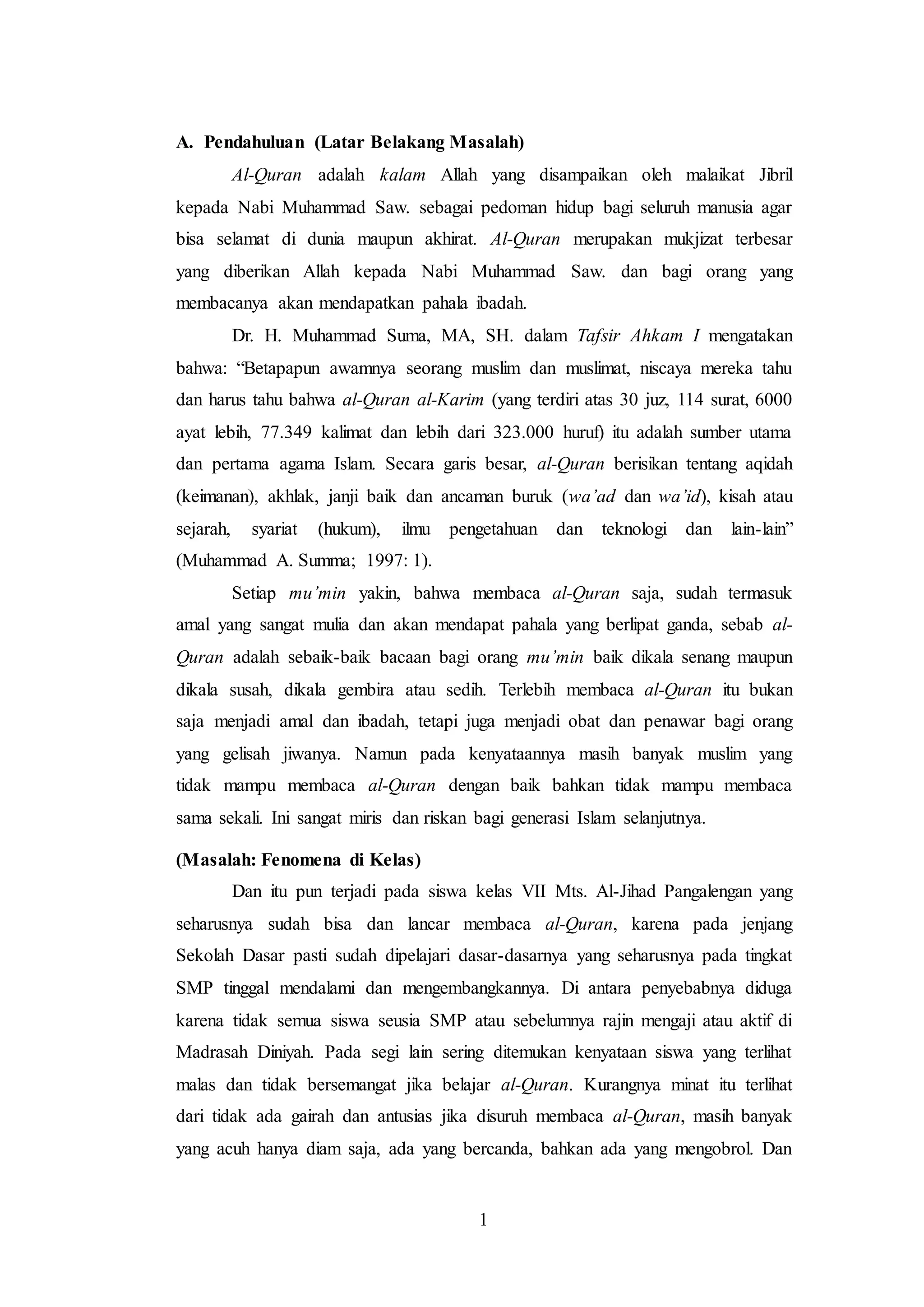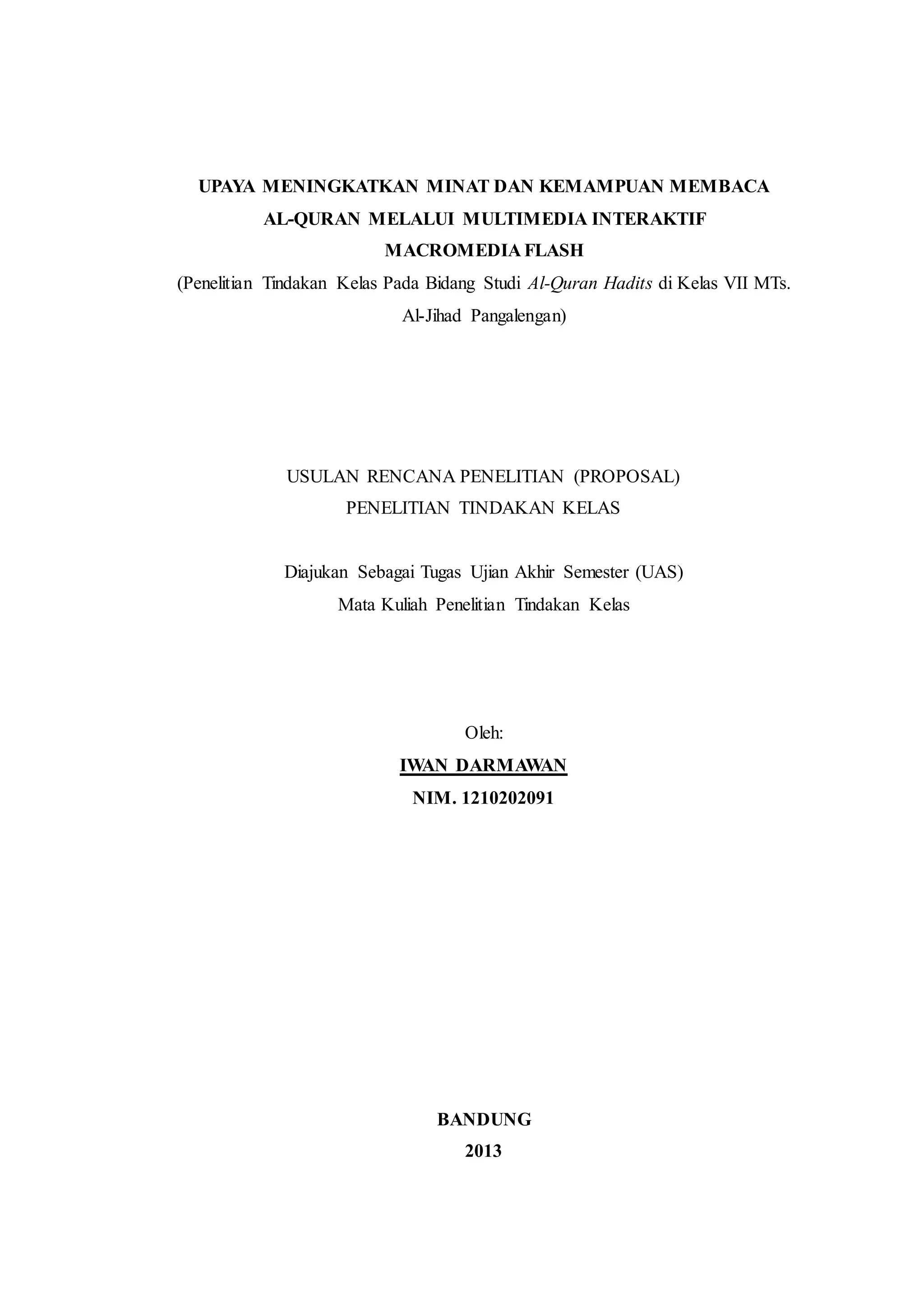 Dokumen tersebut membahas rencana penelitian tindakan kelas untuk meningkatkan minat dan kemampuan membaca Al-Quran siswa kelas VII MTs. Al-Jihad Pangalengan dengan menggunakan multimedia interaktif Macromedia Flash. Penelitian ini bertujuan untuk memastikan proses pembelajaran menggunakan multimedia tersebut berjalan dengan baik dan mampu meningkatkan minat serta kemampuan membaca