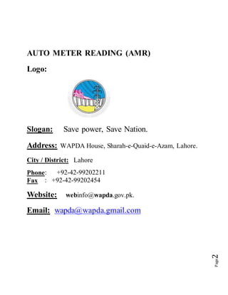 The document outlines a proposal for an automatic meter reading (AMR) system for WAPDA, Pakistan's largest electricity provider. It currently uses a manual meter reading process that is inefficient and prone to errors. The proposed AMR system would use Arduino technology to allow remote reading of meters via an online system. This would save significant time and costs compared to the current manual process while also improving accuracy of billing. The proposal includes details on the technical workings, objectives, budget, and expected benefits of implementing the new AMR system.