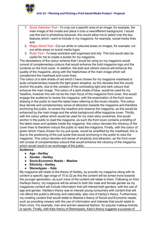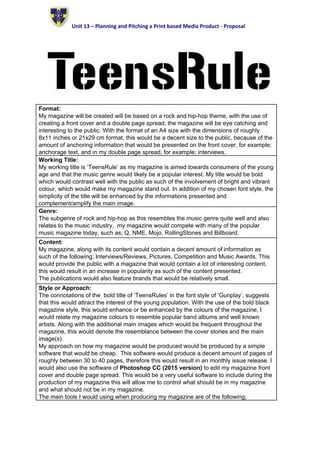 My magazine will be aimed at teenagers interested in rock and hip-hop music. It will be published monthly in a magazine format of 8.5x11 inches with 30-40 pages. The working title is "TeensRule" in a bold font to attract younger readers. The content will include interviews, reviews, photos, competitions and music awards. It will be produced using Photoshop and cost between £2-3 per issue. The target audience is ages 15-22 of both genders. [END SUMMARY]