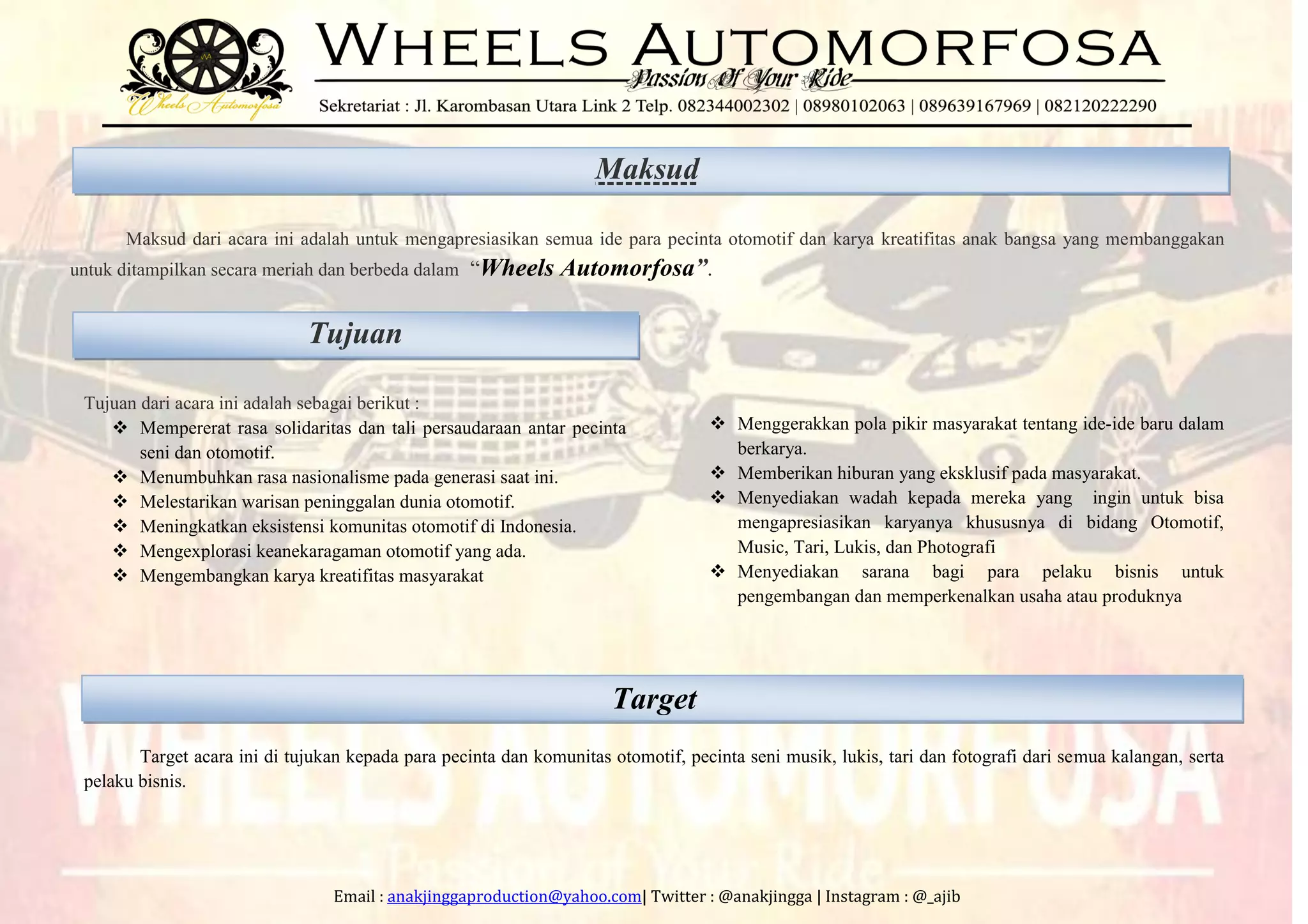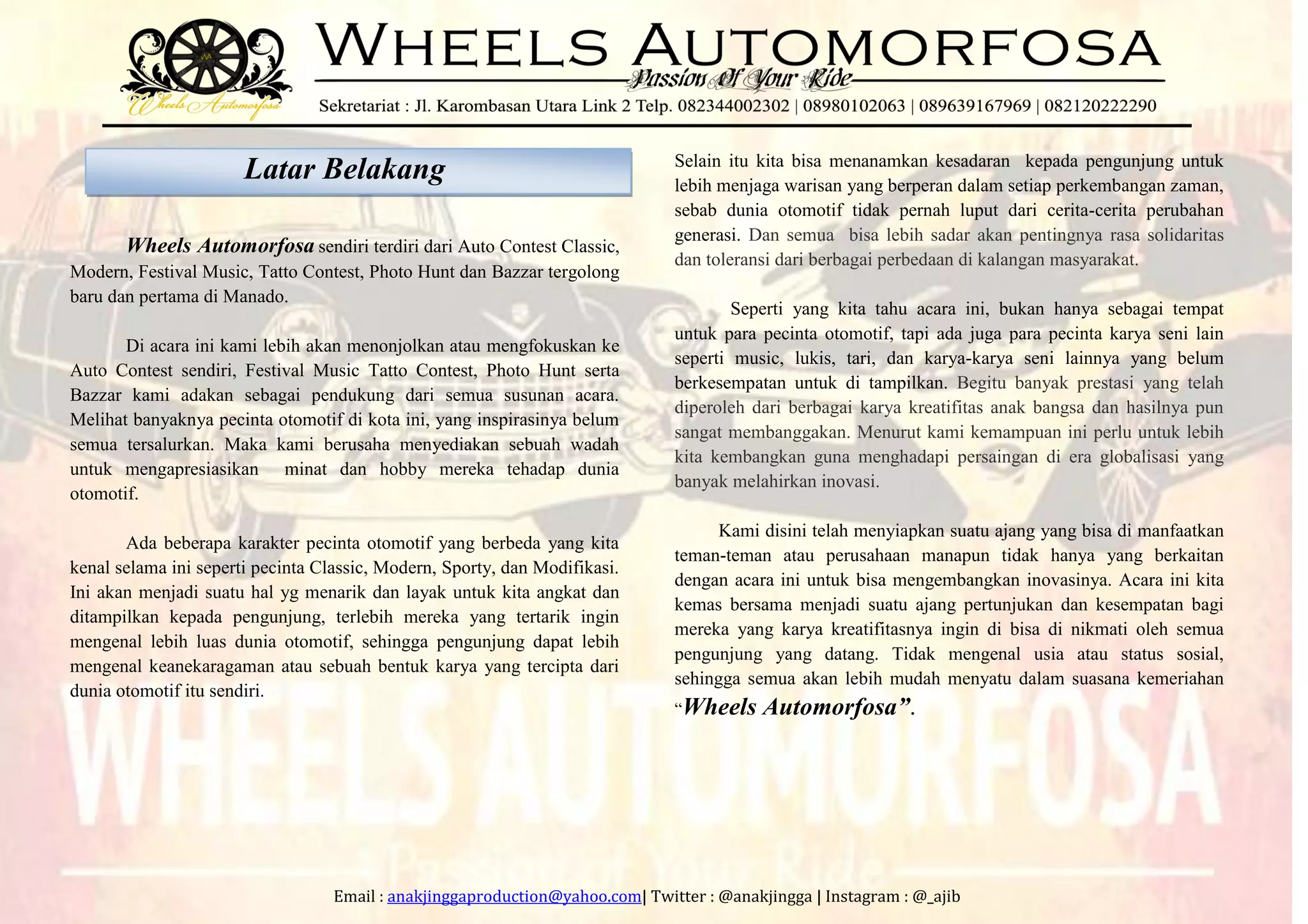 Acara 'Wheels Automorfosa', yang diadakan di Manado, bertujuan untuk merayakan dan mengapresiasi dunia otomotif serta berbagai karya seni, dengan kegiatan seperti auto contest, festival musik, dan bazaar. Kegiatan ini akan mempererat solidaritas antar pecinta otomotif dan seni, serta mengembangkan kreativitas dan kesadaran masyarakat terhadap pentingnya warisan otomotif. Acara ini diharapkan dapat menarik berbagai kalangan, dari komunitas otomotif hingga pelaku bisnis, untuk berpartisipasi dan menyebarkan ide-ide baru.