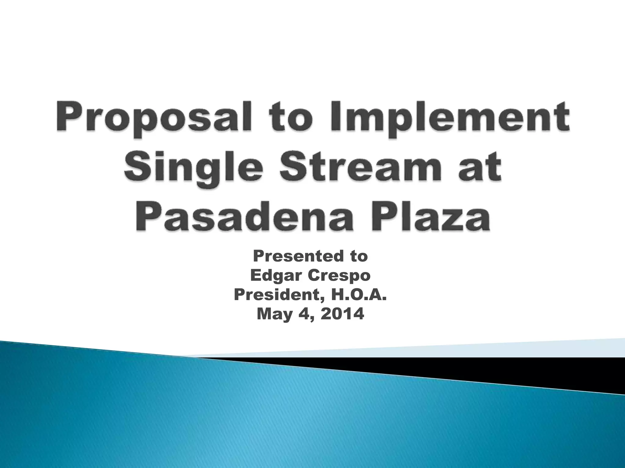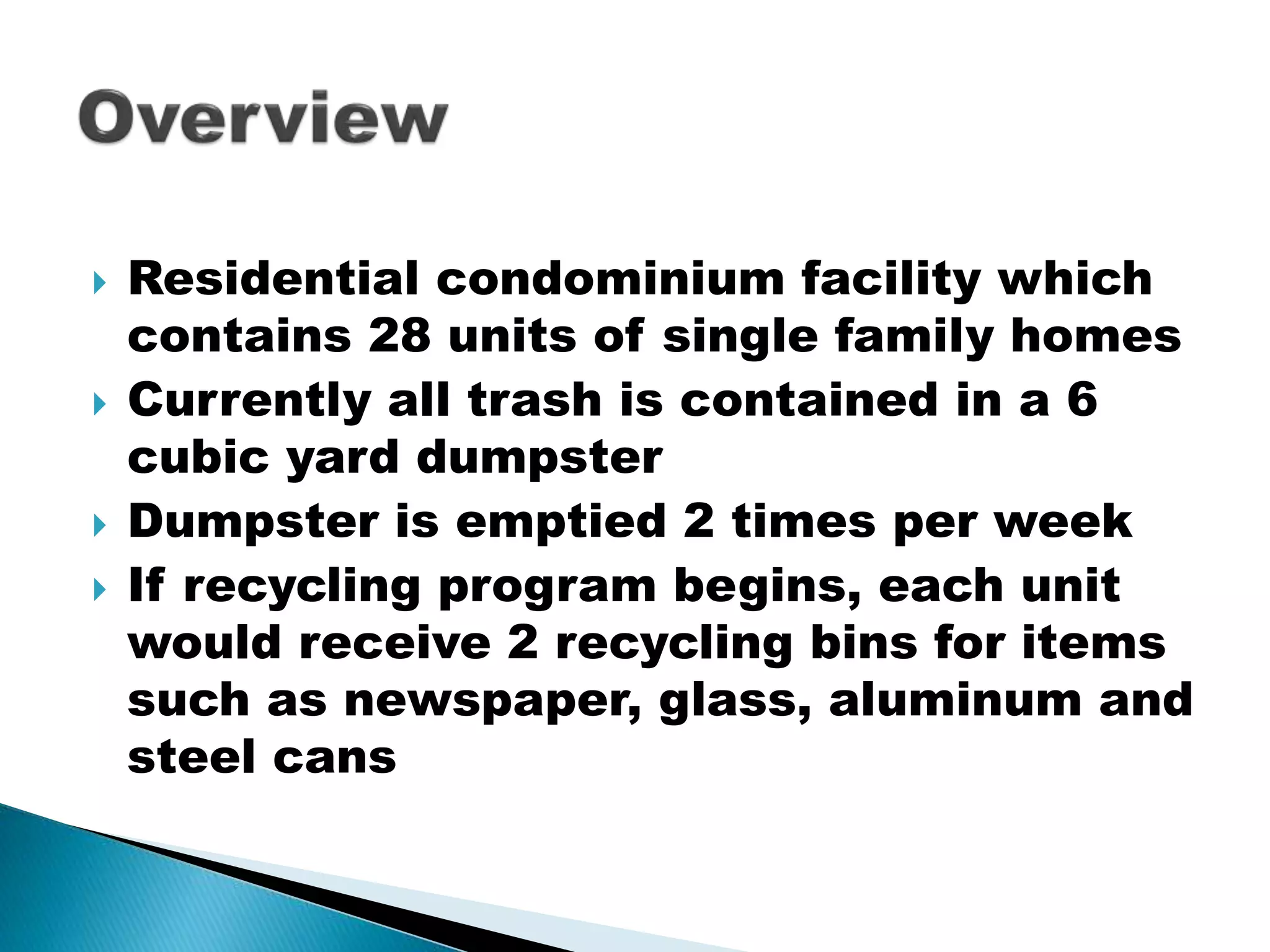 The document proposes implementing a recycling program for a 28-unit residential condominium facility that currently uses a dumpster for all trash. It notes that over 75% of the trash in the local landfill could be recycled and participating would reduce landfill waste. The benefits are listed as financial savings and environmental conservation while the risks are inconvenience and potential overfilling of bins. It recommends enrolling units in the program, holding an informational meeting, distributing recycling guidelines and reducing regular trash pickup to implement the program.