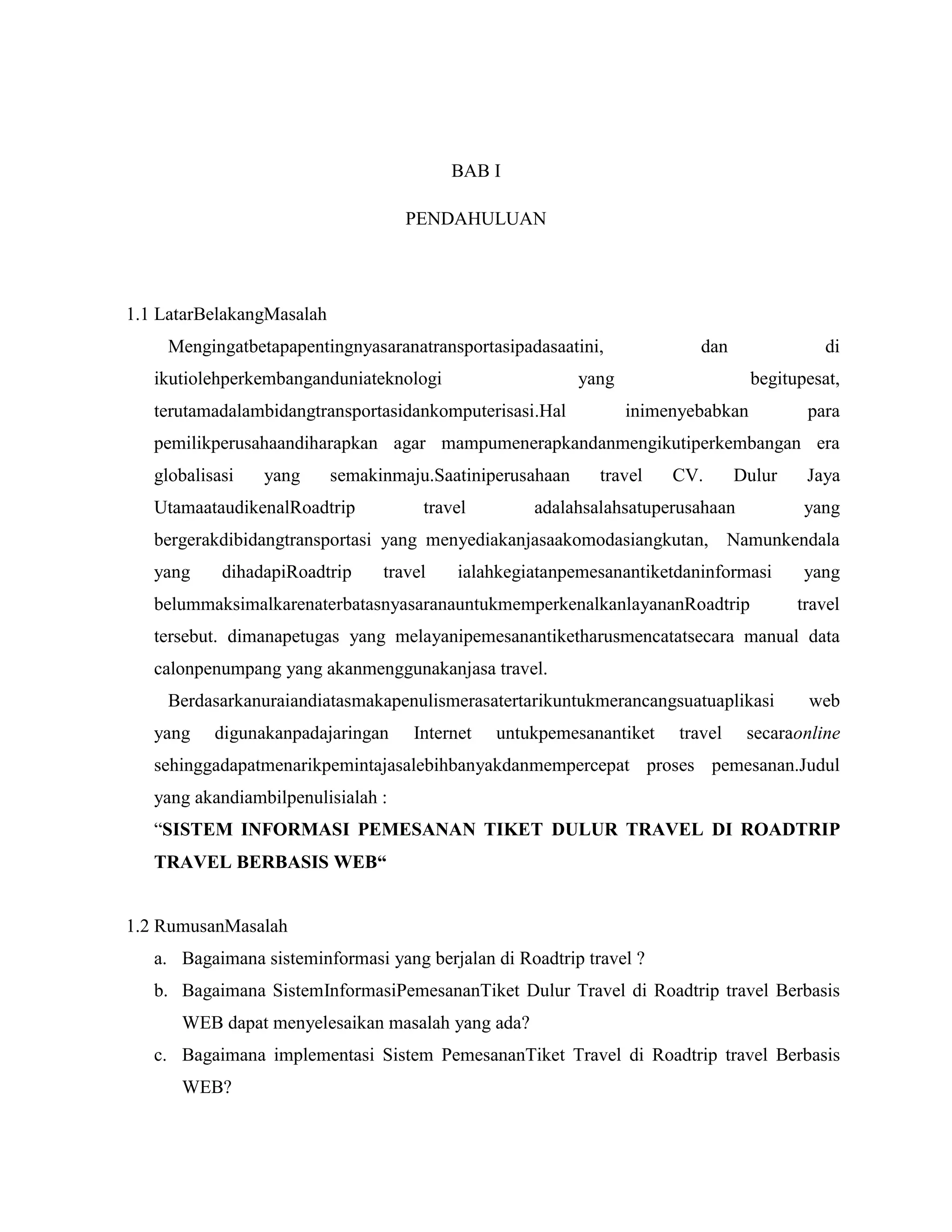 Proposal ini mengusulkan pengembangan sistem informasi pemesanan tiket berbasis web untuk perusahaan travel Dulur di Roadtrip Travel, guna meningkatkan efisiensi dan menarik lebih banyak pelanggan. Masalah yang dihadapi meliputi sistem pemesanan manual yang tidak optimal, sehingga penulis merencanakan aplikasi online untuk mempercepat dan mempermudah proses pemesanan tiket. Penelitian ini dibatasi pada aspek informasi dan pemesanan tiket, tanpa mencakup pembayaran dan laporan keuangan.