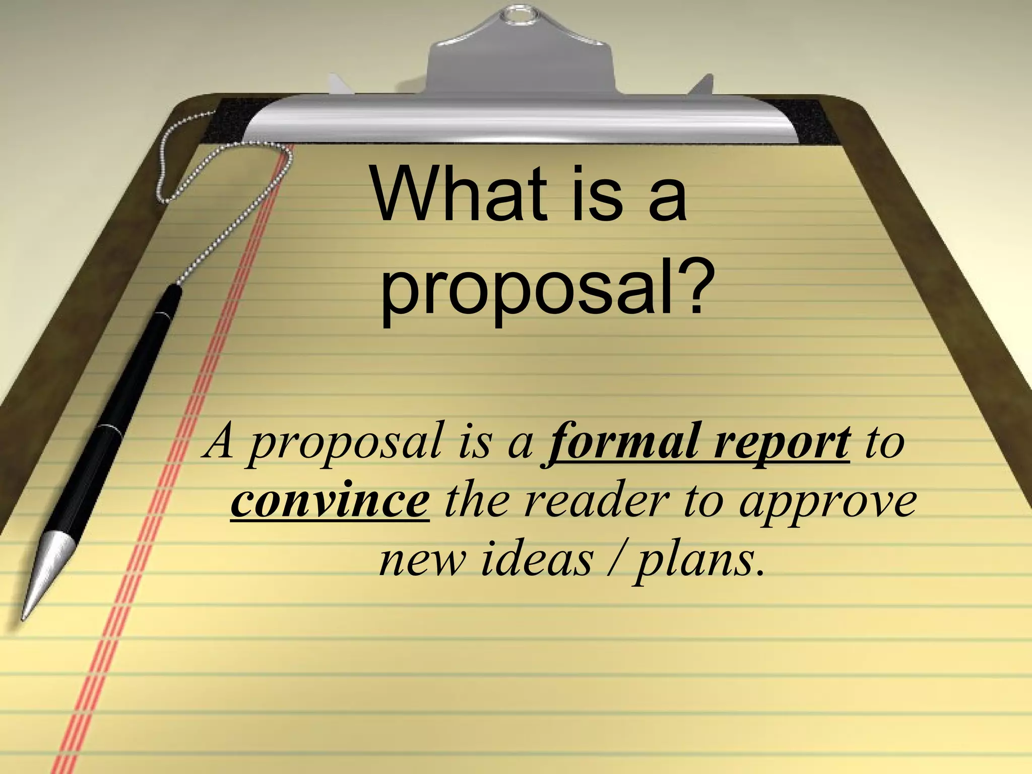 The document provides guidance on how to write an effective proposal. It explains that a proposal aims to convince the reader to approve new ideas or plans. It should outline the objectives, details, and steps or course of action, and persuade the reader that the plans are worth undertaking. The document recommends using a formal tone, clear language, transition words, and future tense to convey positivity about results. It also provides tips on proposal format, including addressing the recipient, introducing and summarizing the plan, elaborating ideas in paragraphs, and concluding with a summary to make one final appeal to the reader.