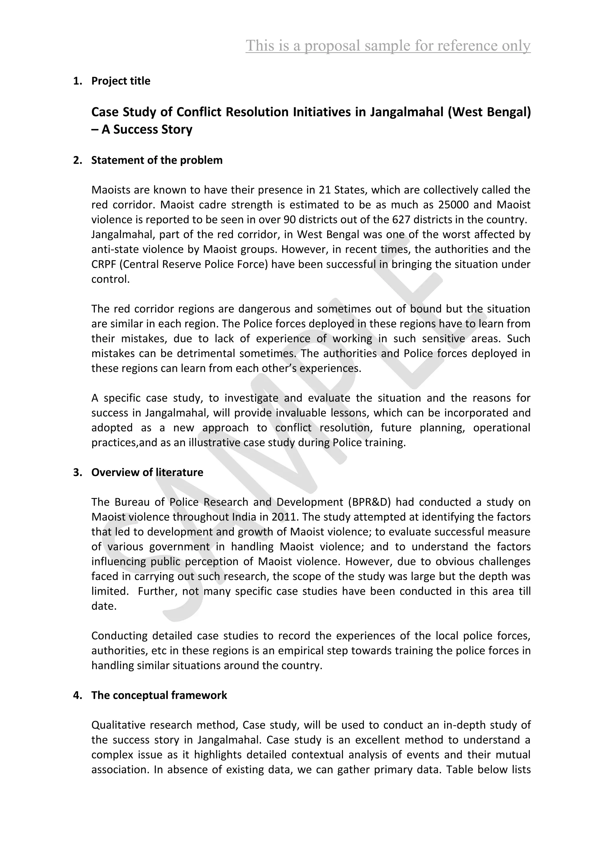 This proposal outlines a case study of conflict resolution initiatives in Jangalmahal, West Bengal. Maoist violence has affected over 90 districts in India, including Jangalmahal. Recently, authorities and police have successfully brought the situation in Jangalmahal under control. The proposal aims to investigate the reasons for this success through qualitative research methods like interviews and observations. The case study findings will provide lessons for handling similar conflicts elsewhere. It will examine the specific actions, unresolved issues, and systemic features in Jangalmahal that could be replicated. The estimated cost is Rs. 5,00,000 and will be conducted over 5 weeks by a chief investigator, 2 research assistants, and utilize existing organization