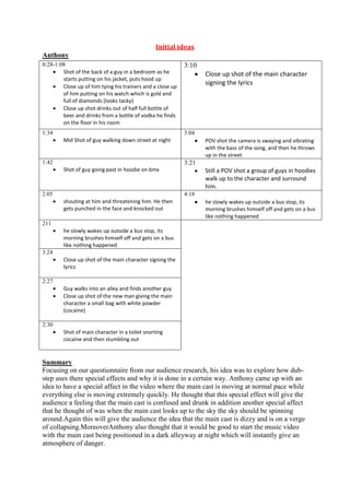 The proposed music video ideas focus on themes of danger, drinking, and confrontation. Anthony's idea follows a character who drinks alone in his room before encountering a gang at night who threaten and knock him out. Me's idea shows a character getting drunk at a bar before stumbling out and bumping into a gang, creating tension. Zayd's idea establishes a North London location and shows the character drinking at a bar before being attacked outside. All three ideas involve the character encountering danger after drinking alcohol.