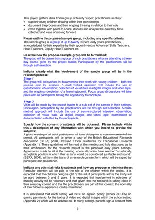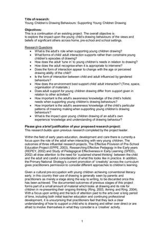 This document outlines a proposed research project that will explore how adults can best support young children's drawing behaviors. The research will involve observing interactions between 20 expert early childhood educators and the young children they work with during drawing activities. The goals are to understand the educator's role in supporting drawing, how different types of interactions can help or constrain children's drawing, and how educators can tune into children's needs and appropriately intervene. The project will collect data through observations, interviews, photos/videos, and educators' reflective journals. Strict protocols for obtaining consent and ensuring anonymity/confidentiality will be followed.