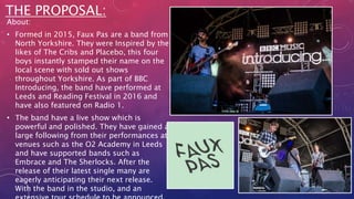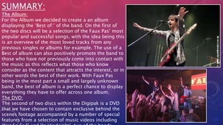 The document proposes a "Best of" album for the band Faux Pas containing their most popular and successful songs from previous singles and albums. It would include 12 tracks on the first disc. The second disc is a DVD with behind-the-scenes footage and music videos to help promote the band. The proposal also includes details on a music video they plan to make for the song "Finer People," with a storyline about a boy trying to improve himself to get the attention of a girl he likes.