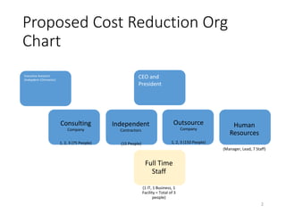 The Transformation Team has recommended reducing costs by closing branches globally, reducing printing, outsourcing IT infrastructure to an overseas third party, eliminating perks and benefits, and reducing full-time staff and pensions based on a year-long analysis. The proposed new organizational chart shows outsourcing most functions to independent contractors and third party companies with a much smaller core of human resources staff and 3 remaining full-time employees reporting to the CEO.