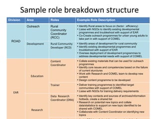 This document proposes an organizational structure for Project Ubah with four divisions: Education & Research (EAR), Rural Outreach and Development (ROAD), Communications, Multimedia and Language (COMEL), and Support. EAR focuses on education, research, and rural outreach. ROAD's focus is on outreach and development programs. COMEL handles communications, multimedia, and languages. Example roles are provided for each division and area.