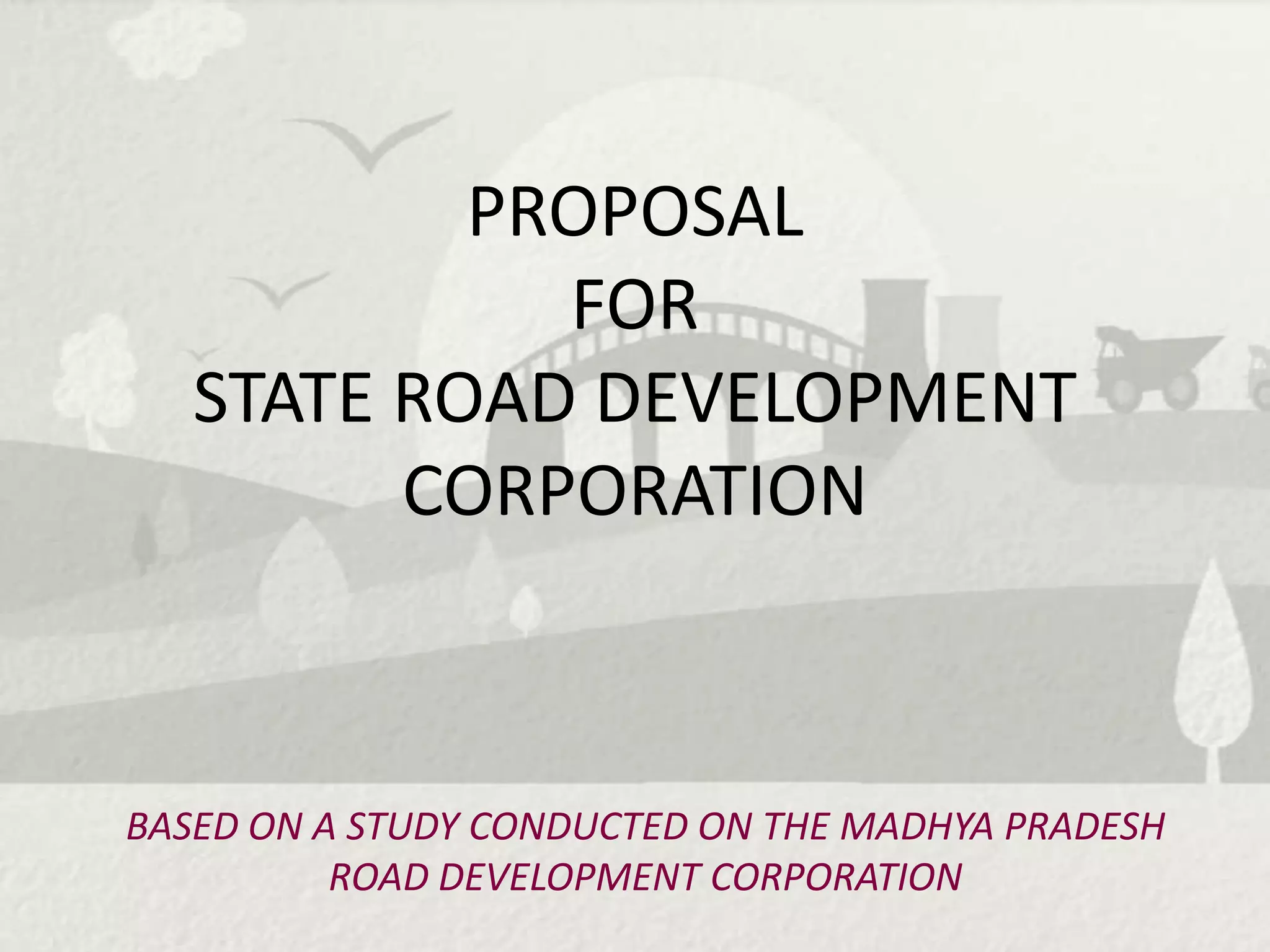 The document proposes establishing a State Road Development Corporation based on the model of the Madhya Pradesh Road Development Corporation (MPRDC). It summarizes MPRDC's achievements in developing over 3,300 km of roads worth over 6 billion rupees through public-private partnerships. The proposed corporation would aim to leverage private investment to boost infrastructure development while ensuring affordable transportation access for citizens.