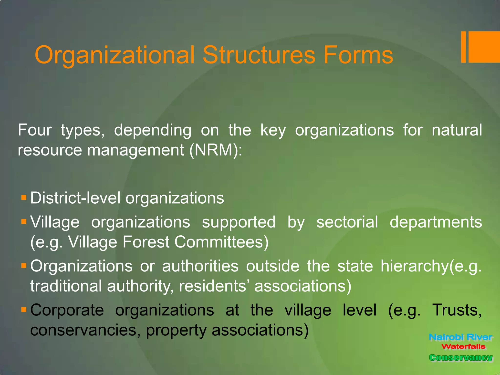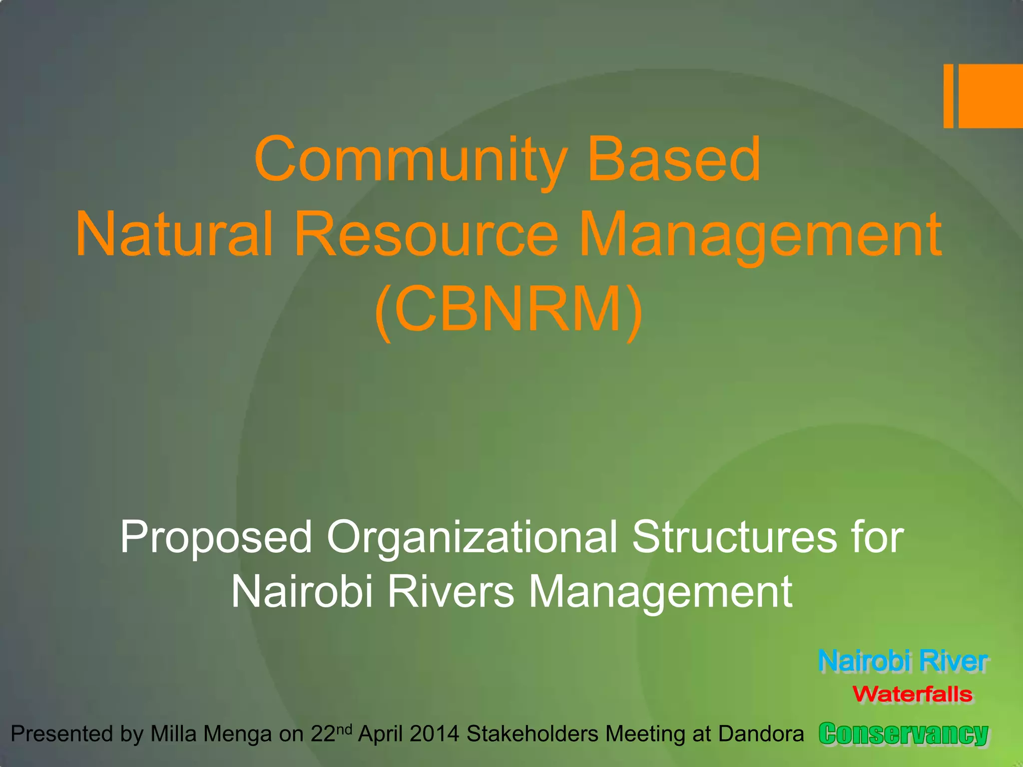 The document outlines proposed organizational structures for community-based natural resource management (CBNRM) in Nairobi, emphasizing four main types based on different stakeholders. It highlights various case studies demonstrating the impact of local governance, community involvement, and external support on the success of resource management initiatives. Recommendations include enhancing the authority of village organizations and establishing a trust for the Nairobi River Waterfalls Conservancy to ensure sustainable management and community engagement.