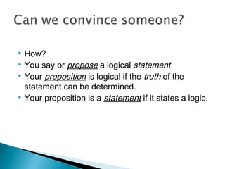 The document discusses the concept of logical propositions and how to determine their truth values through examples. It emphasizes that a logical proposition must assert something that can be evaluated as true or false, and it explores various examples of statements to identify which are propositions. The document also includes exercises on forming negations of propositions and group discussions to analyze logical expressions.