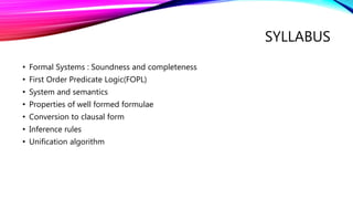 This document provides an overview of propositional logic and introduces first-order predicate logic. It discusses formal systems, soundness and completeness. It also covers topics like the truth table, tautology, first-order logic syntax and semantics, properties of well-formed formulae, conversion to clausal form, inference rules, and the unification algorithm.