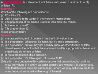 The document discusses propositions, defining them as statements with truth values that can be true or false, and includes examples to illustrate this concept. It also introduces fuzzy logic, differentiating it from classical logic by explaining its range of truth values and providing an example of how fuzzy variables are used in decision-making processes. Lastly, there is a demonstration of applying fuzzy logic in a risk assessment system based on funding and staffing levels.