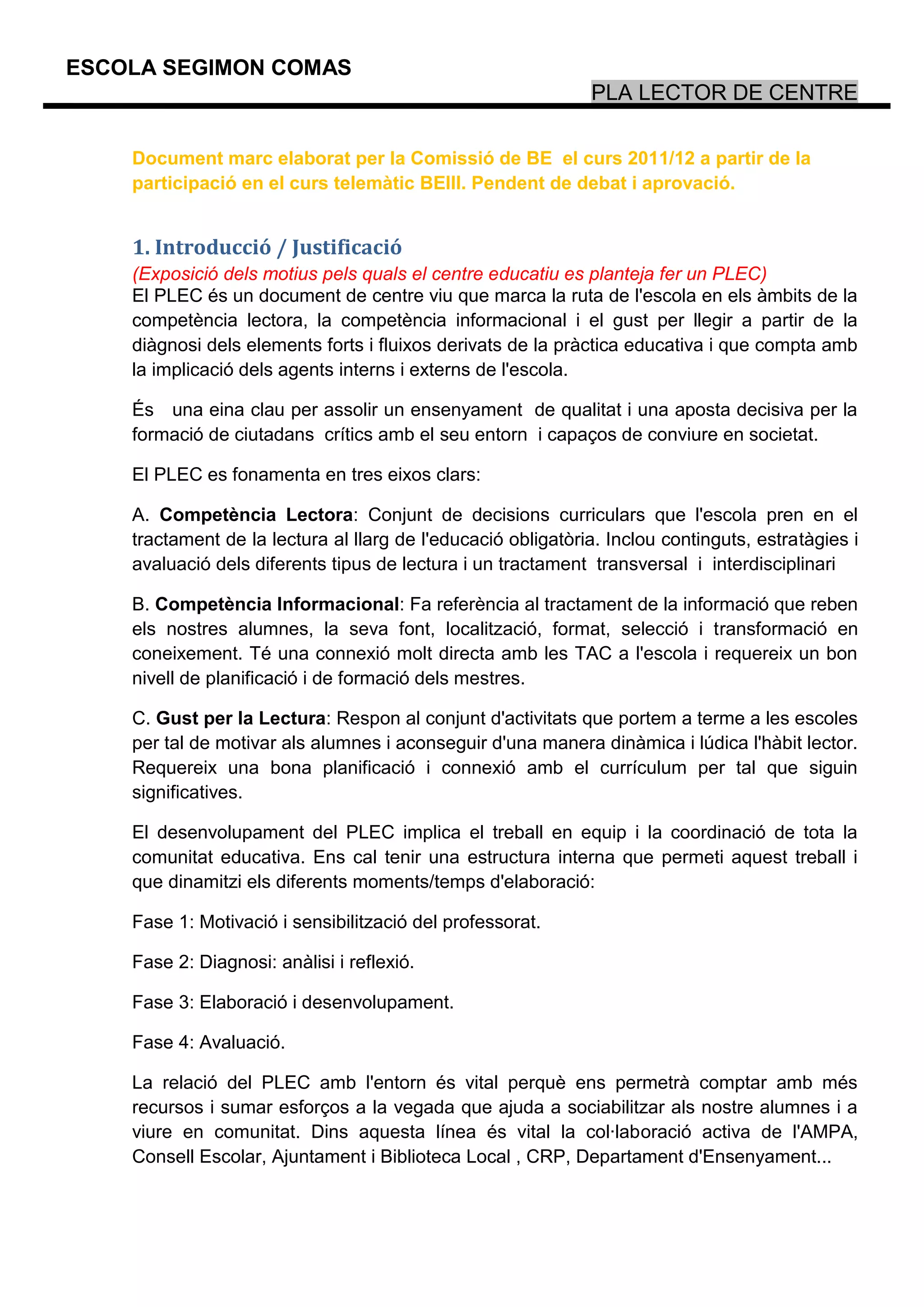 documents que passem a formar part del PLEC q ja tenim elaborats a nivell d'escola.