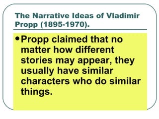 The document discusses Vladimir Propp's theory of narrative structures. Propp claimed that most stories contain similar character archetypes that fulfill common roles, which he called "spheres of action". These include the hero, villain, princess, father of the princess, false hero, helper, donor, and dispatcher. The document provides brief descriptions of the common roles fulfilled by each of these character types in stories according to Propp's theory.
