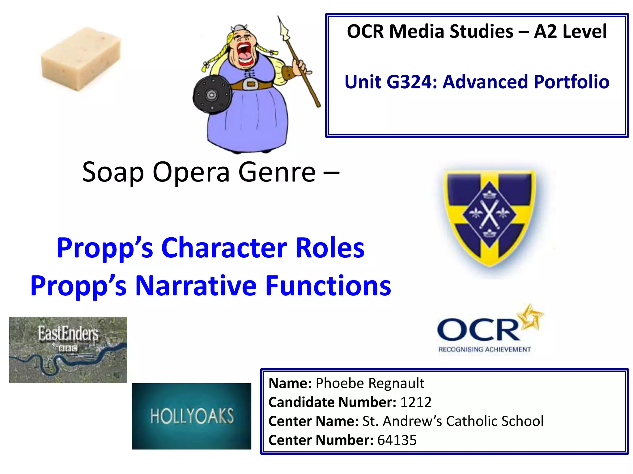 The document discusses Propp's character roles and narrative functions as seen in trailers for the soap operas Hollyoaks and EastEnders. In Hollyoaks, characters taking on hero, villain, and false hero roles are identified. A narrative of victory is seen as a woman confronts the "hospital killer." In EastEnders, a woman's aggressive actions suggest she is a villain, while a man receiving dying flowers may be a false hero or villain. Trickery and villainy disrupting a family are identified as narrative functions.