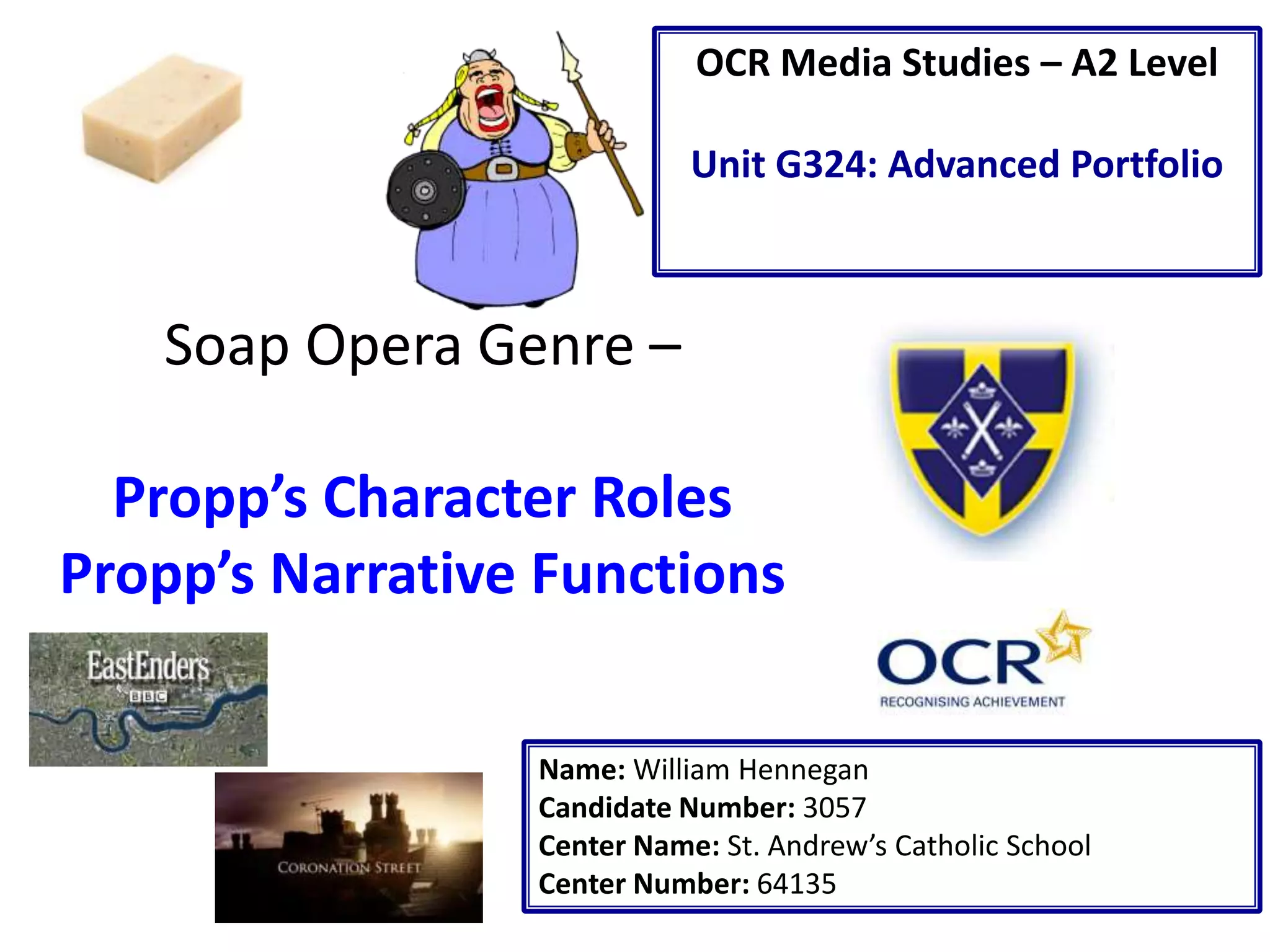 The document discusses soap opera genres and Propp's character roles and narrative functions. It analyzes two trailers using Propp's framework: Coronation Street and EastEnders. In Coronation Street, a character is seen staring at a bottle and walking past another, creating tension. In EastEnders, the police inspector interrogating an arrested man is portrayed as the villain through his stern appearance. The arrested man shows innocence through peaceful behavior. The document then outlines narrative functions seen in the trailers, such as villainy, struggle, trickery and pursuit.