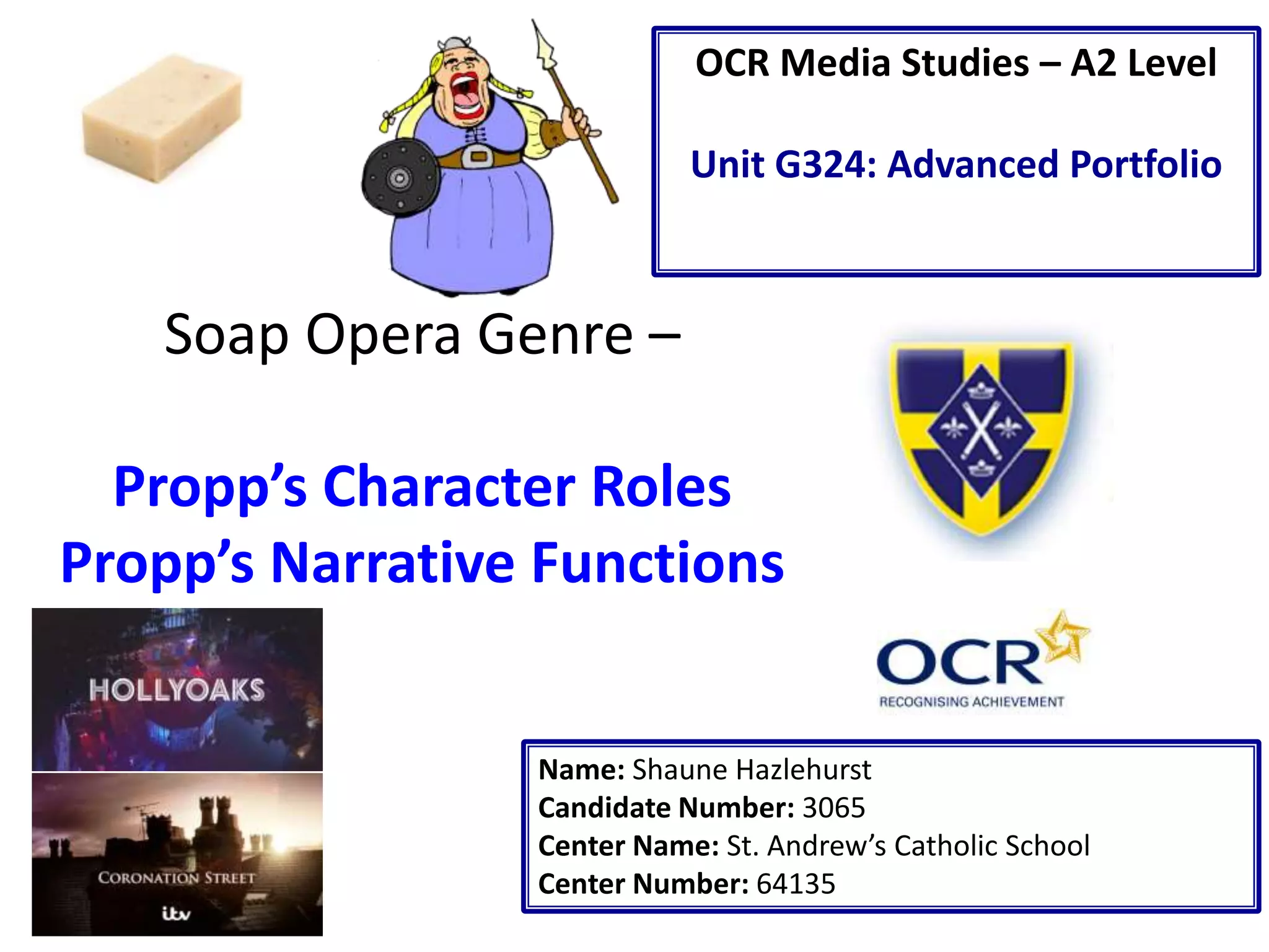 The document discusses the soap opera genre and analyzes two trailers using Propp's character roles and narrative functions. It identifies the villains and heroes in each trailer based on verbal codes like dialogue and technical codes like shot types and facial expressions. It summarizes the struggles between heroes and villains and the ways villains are exposed in each trailer.