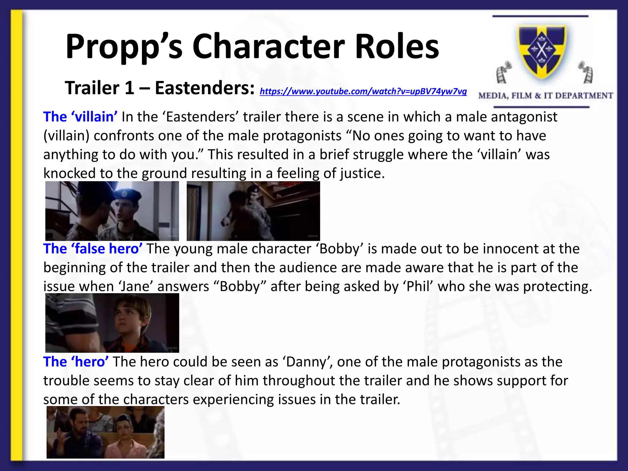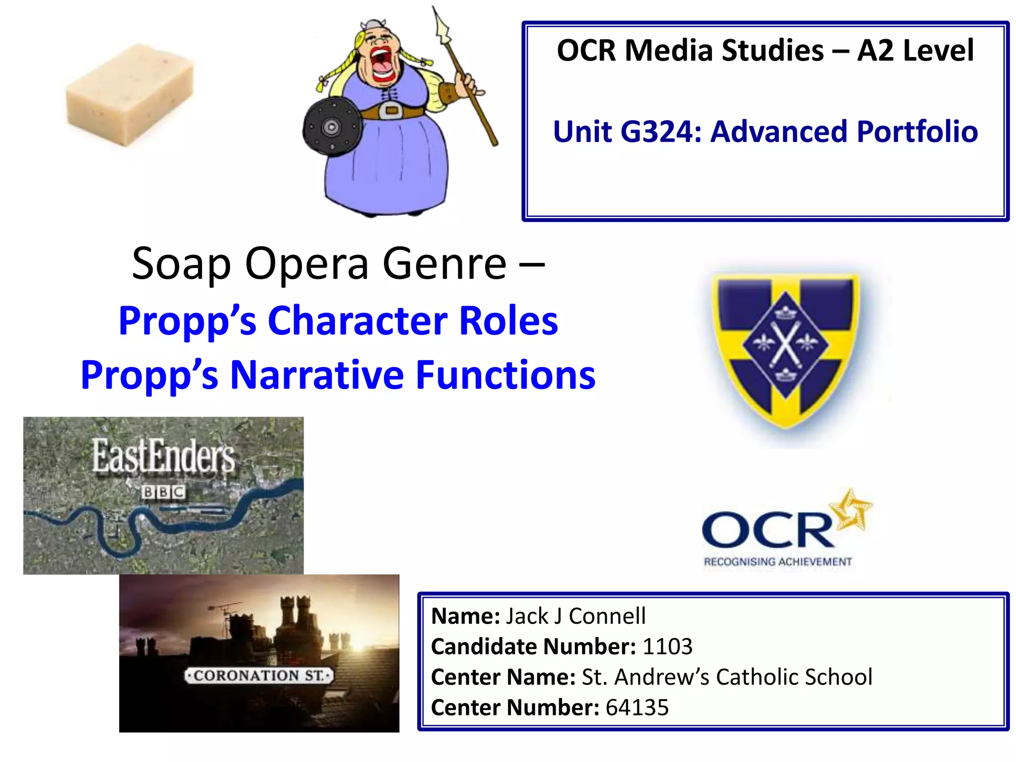 The document discusses soap opera genres and Propp's character roles and narrative functions. It analyzes two trailers from soap operas Eastenders and Coronation Street based on these concepts. In Eastenders, there is a struggle between the villain and hero, and punishment of the princess character. In Coronation Street, there is trickery by the villain, a struggle between two princess characters, and a princess seeks reconnaissance from other characters at the end.